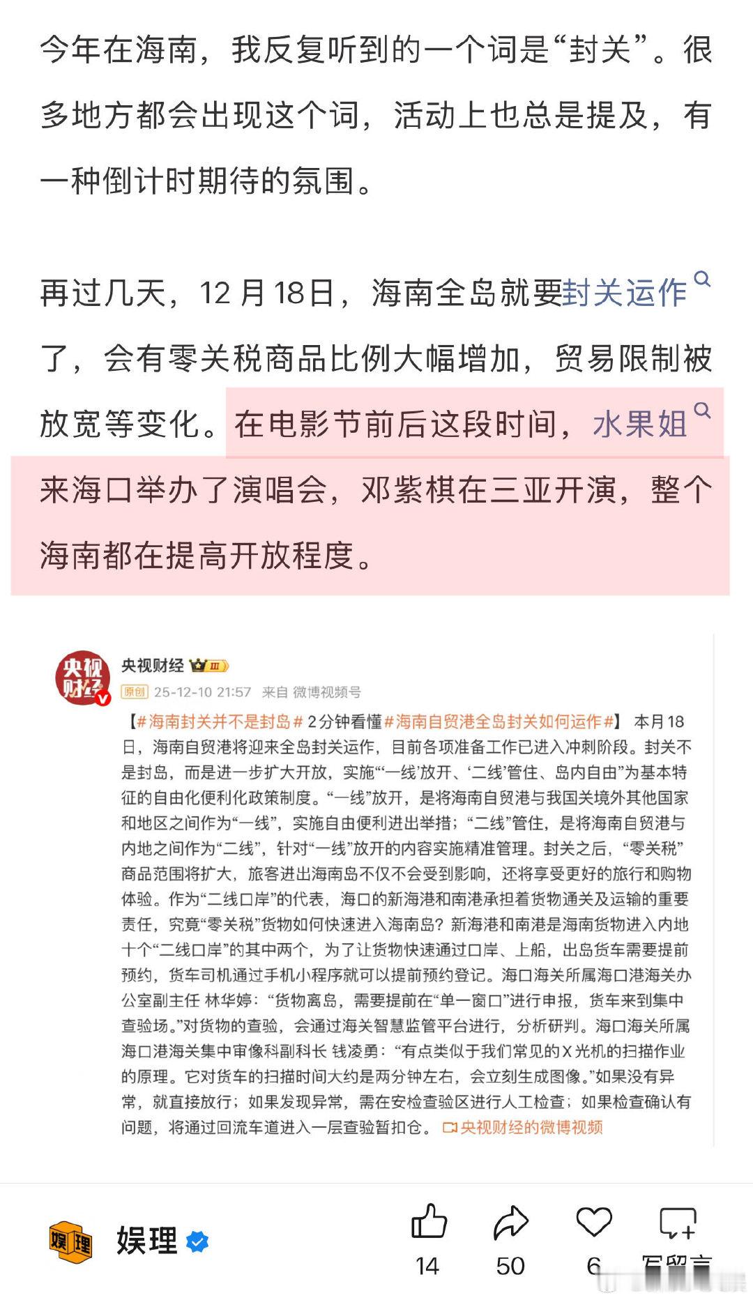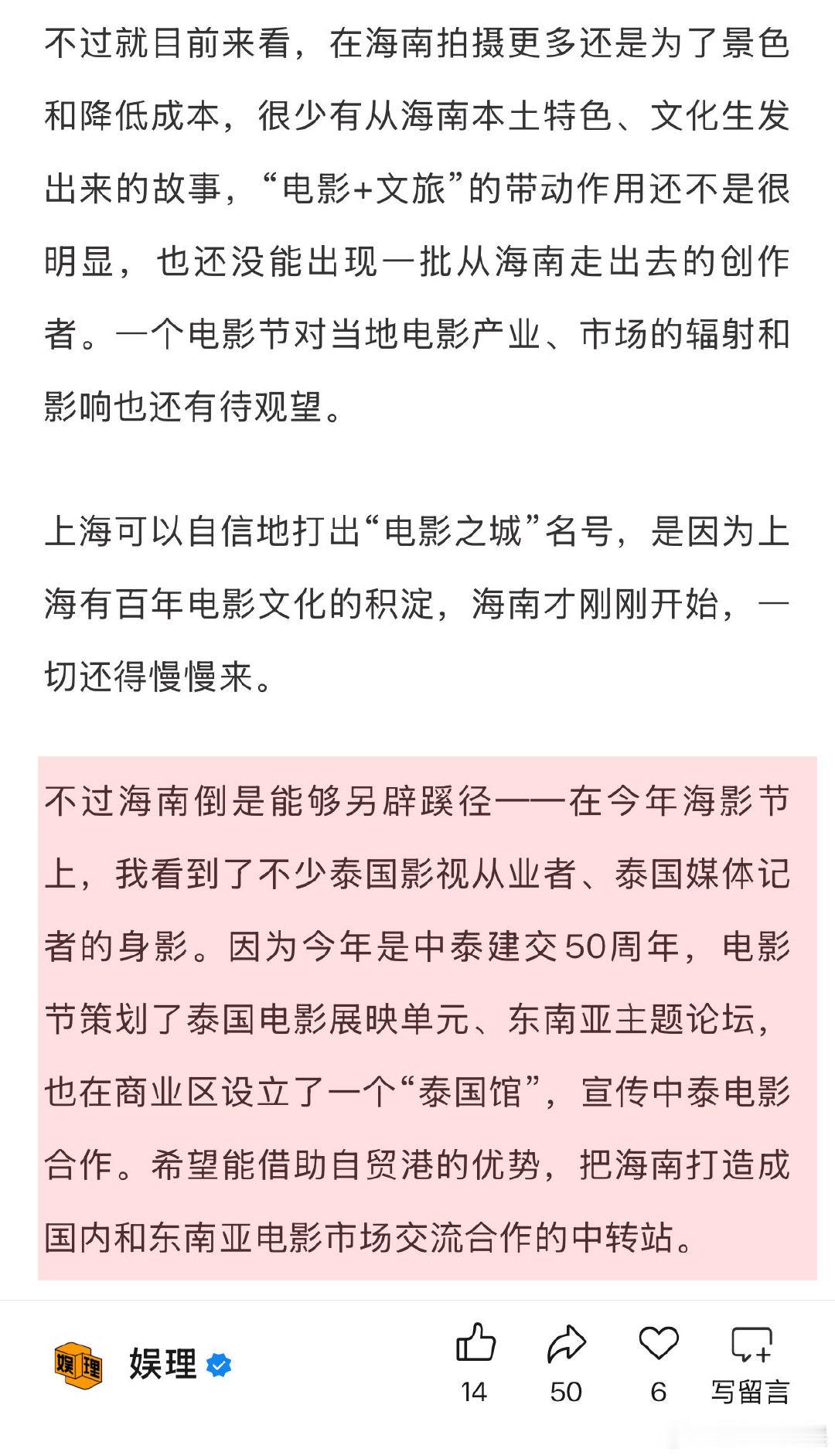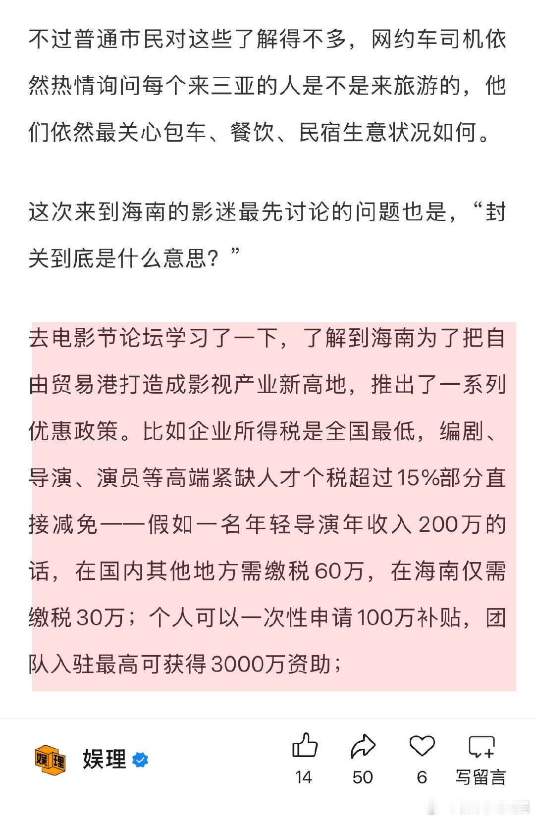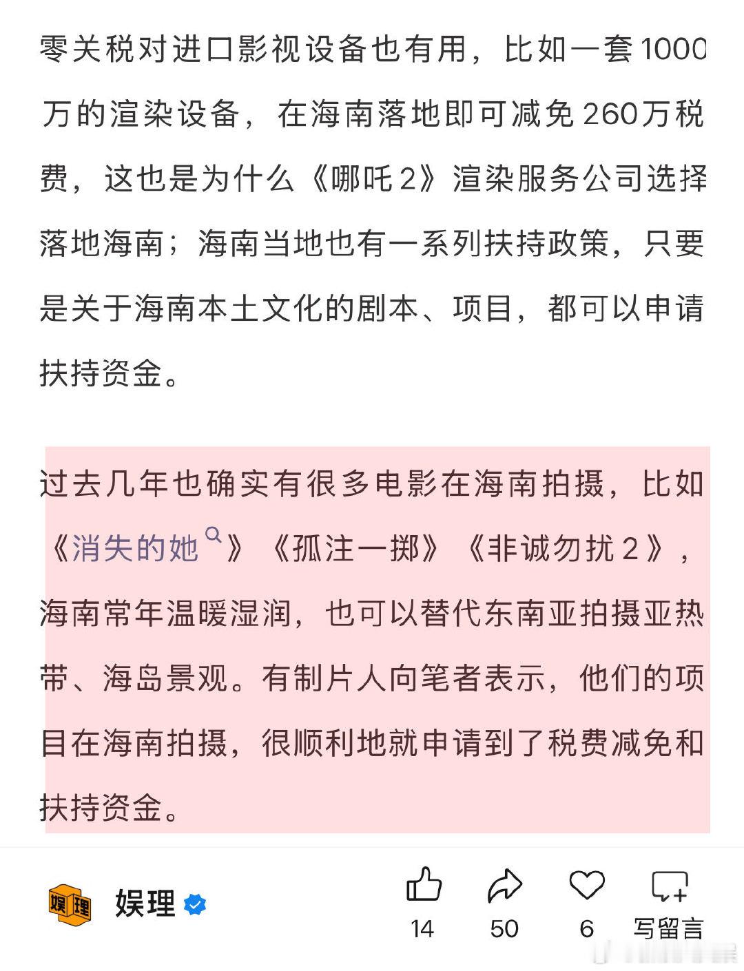 海南岛电影节正在步入正轨 今年的海南岛电影节有哪些变化 海南当地有一系列扶持政策,只要是关于海南本土文化的剧本、项目,都可以申请扶持资金。过去几年确实有很多电影在海南拍摄,比如《消失的她》《孤注一掷》《非诚勿扰2》。有制片人向表示,他们的项目在海南拍摄,很顺利地就申请到了税费减免和扶持资金。娱理独家↓