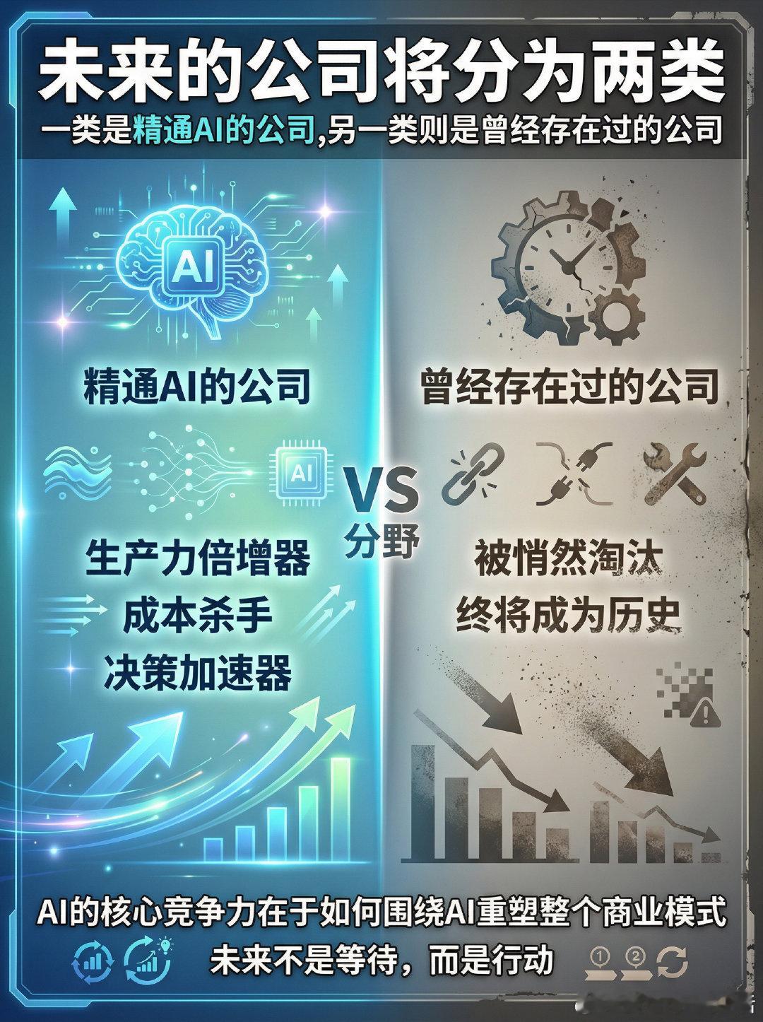 未来的公司将分为两类:一类是精通AI的公司,另一类则是曾经存在过的公司。 AI不仅是技术升级,而是生产力的倍增器、成本杀手和决策加速器。那些将AI深度融入流程的企业,将以更少的人力跑得更快;而犹豫观望的企业,最终会被悄然淘汰。历史告诉我们,忽视平台变革的企业终将失败,AI是下一个不可逆转的浪潮。 有人担忧这会带来全球范围的失业和贫富分化;也有人认为,反AI的行业如健身、餐饮、线下体验依然有生存空间。更有人指出,未来不仅是“懂AI”的企业,还有那些懂得保护数据隐私的企业。 AI的核心竞争力不仅在于应用本身,而在于如何围绕AI重塑整个商业模式,打造数据反馈闭环,快速迭代创新。只有这样,才能避免用明天的成本运营昨天的业务,最终被市场淘汰。 这场变革不仅是技术革命,更是商业思维的革命。企业若不主动拥抱AI,终将成为历史。个人也将迎来用AI开创自我世界的新机遇。 未来不是等待,而是行动。 x.com/mcuban/status/1999958454757425439
