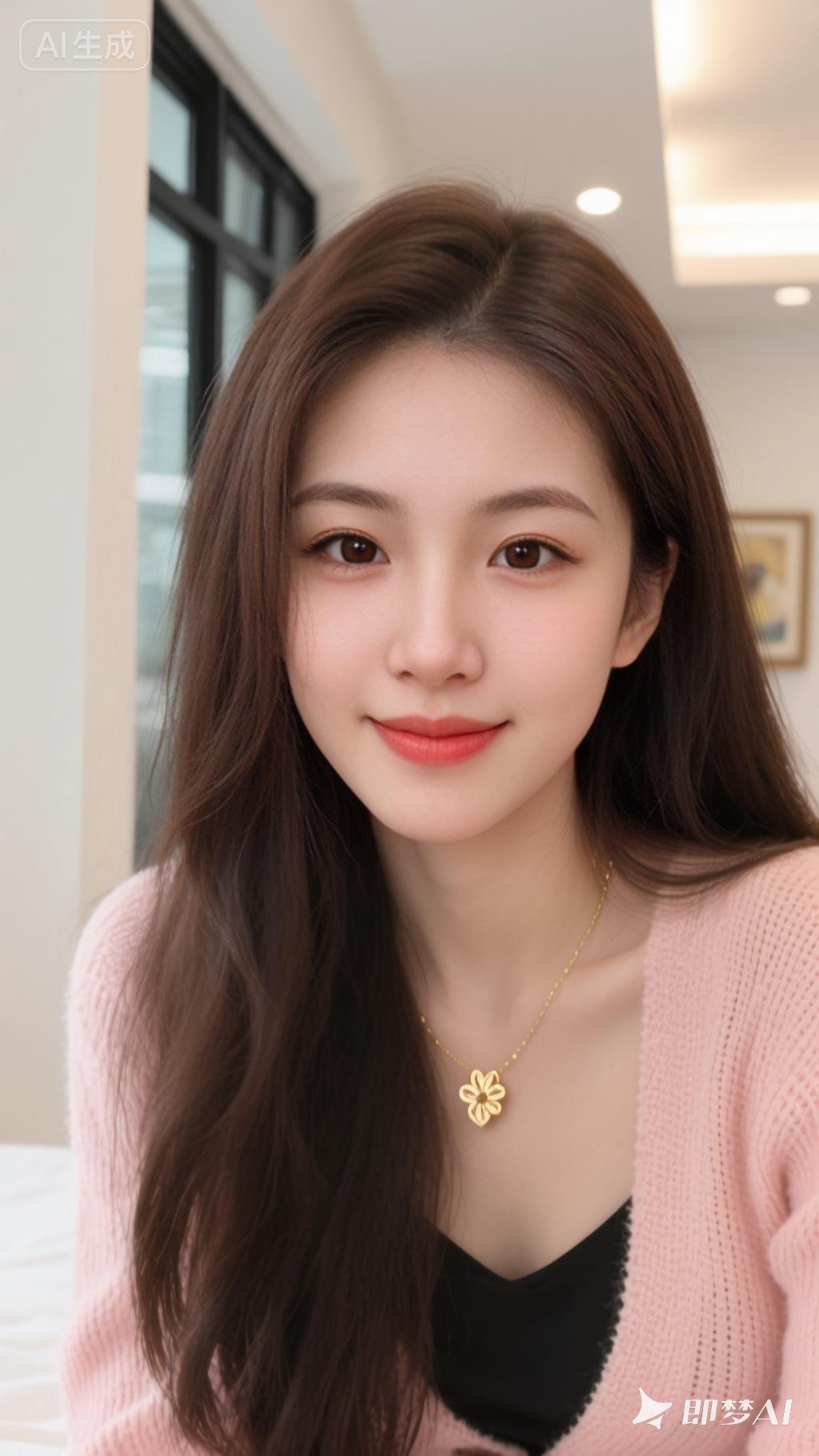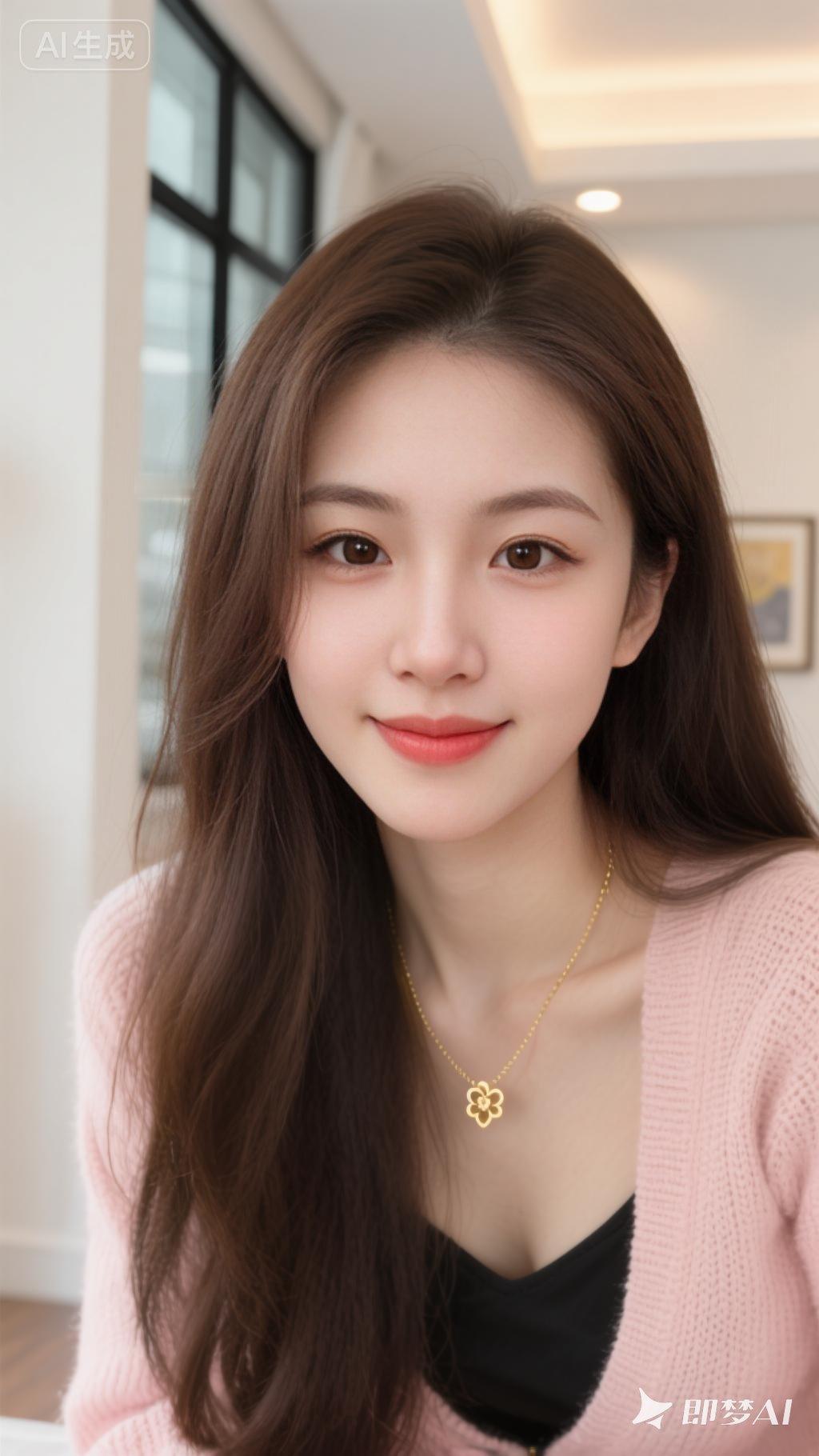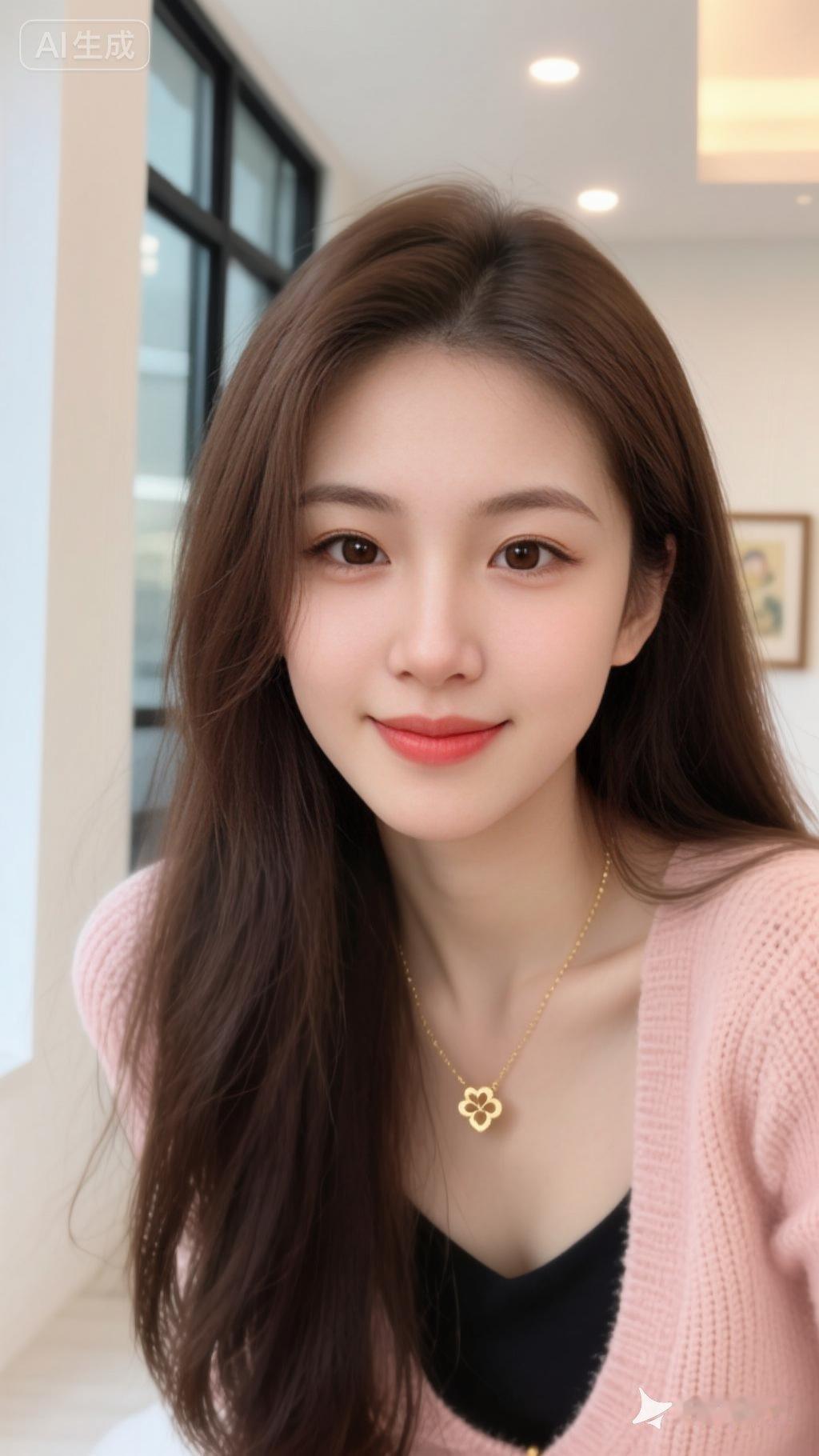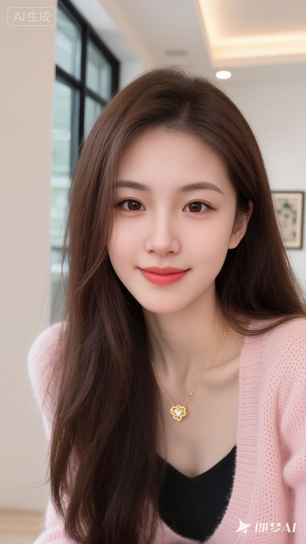 一位长发女性,她的深棕色头发自然垂落,部分发丝轻拂在脸颊旁。她穿着一件浅粉色的针织开衫,内搭黑色上衣,领口处佩戴着一条金色项链,吊坠呈花朵或心形设计。