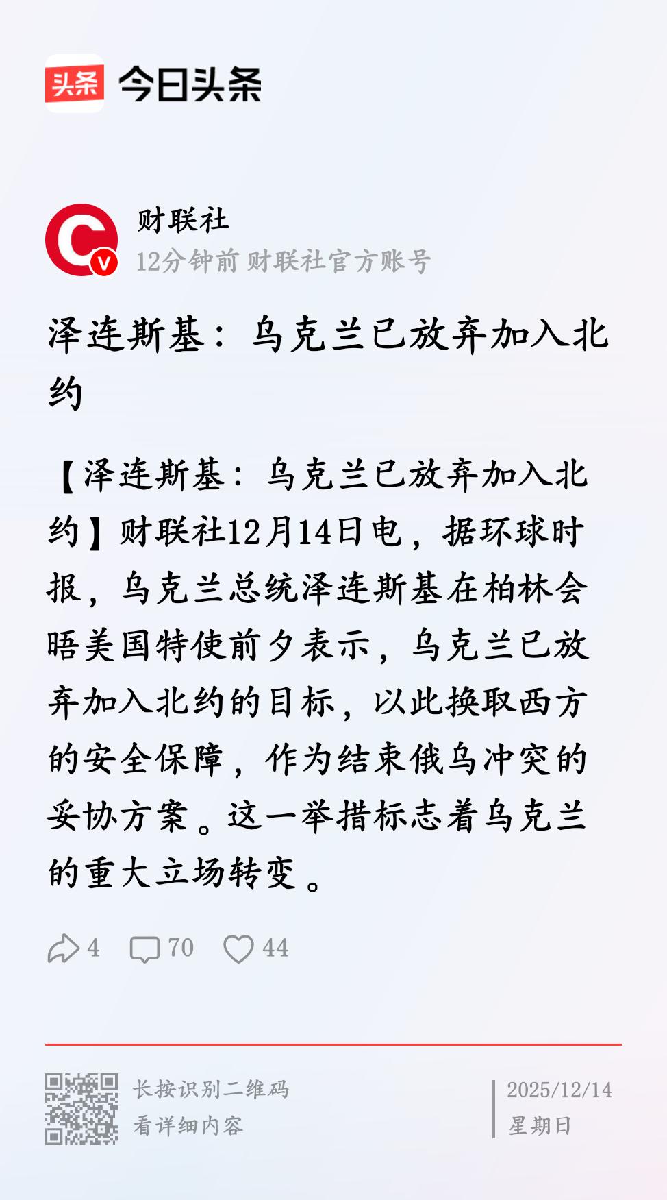 【#泽连斯基称乌克兰放弃加入北约#】财联社12月14日电,据环球时报,乌克兰总统