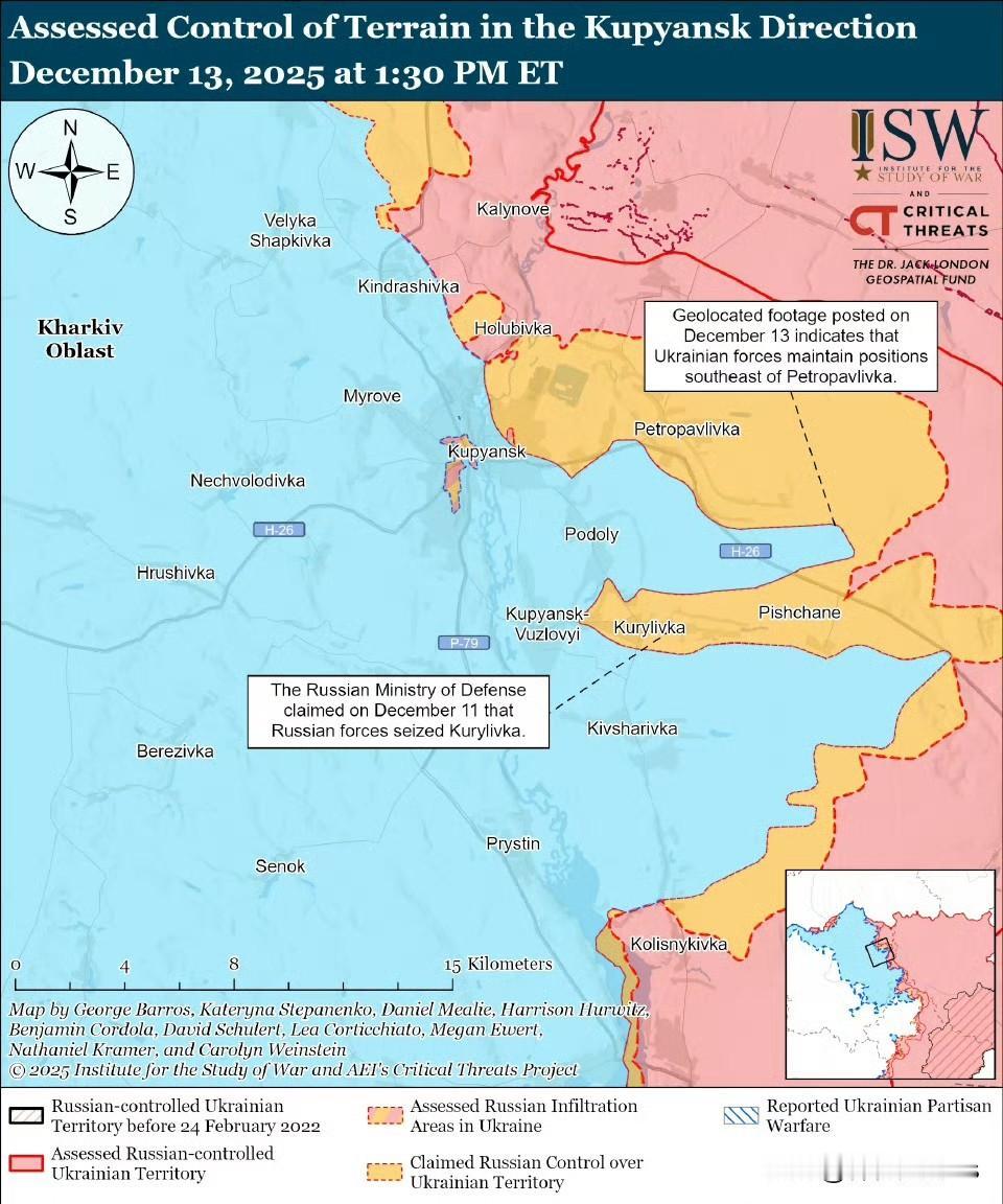 乌克兰军队继续在库皮扬斯克及其周边地区推进,有关反攻行动的更多细节也浮出水面。12月12日公布的地理定位视频显示,乌克兰军队在库皮扬斯克中部进行清剿行动的同时取得了进一步进展,并向彼得罗巴甫利夫卡东南方向(库皮扬斯克以东)推进。乌克兰军事观察员尤里·布图索夫报告称,乌克兰军队完全解放了库皮扬斯克西南部的尤维列伊·米克罗利翁,并评估认为,失去的这些阵地很可能使俄军无法在库皮扬斯克南部维持任何剩余阵地。布图索夫报告称,乌克兰军队仍在库皮扬斯克进行清剿行动,12月12日和13日公布的地理定位视频显示,俄军渗透小组仍然在库皮扬斯克北部和西部活动。乌克兰无人机营参谋长报告称,俄军仍在试图渗透库皮扬斯克,主要依靠徒步行动。俄罗斯军事博客作者承认乌克兰军队推进至尤维列伊尼·米克罗伊翁和库皮扬斯克西北部,并指出米罗韦和拉德基夫卡(均位于库皮扬斯克西北至北部)附近仍在激烈战斗。一位军事博客作者承认俄军失去了拉德基夫卡以及拉德基夫卡南部和东部的两个防御阵地。尽管有证据支持乌克兰方面的报告,但许多俄罗斯军事博客作者仍然对乌克兰方面的许多推进报告表示怀疑或直接否定。 2025年9月,在俄军向库皮扬斯克方向迅速推进并渗透库皮扬斯克城内后,乌克兰军队开始反攻。俄军于2025年夏季向库皮扬斯克方向推进迅速,并在2025年8月初对库皮扬斯克城内构成威胁。8月下旬俄军指挥部开始将渗透库皮扬斯克的行为描述为重大进展。布图索夫的报告表明,俄军利用这些渗透行动推进并巩固了在库皮扬斯克的阵地。布图索夫报告称,俄军第121和第122摩步团(均隶属于列宁格勒军区第6集团军第68摩托化步兵师)、第27摩步旅(第6集团军)和第1855营的突击队在俄军于2025年8月首次渗透进入库皮扬斯克后,在库皮扬斯克建立了持久阵地,并占领了库皮扬斯克北部的一处重要高地——到2025年9月中旬,乌克兰军队的处境变得十分危急。布图索夫报告称,乌克兰军队解放了库皮扬斯克西北部的城镇——9月24日解放了蒂申基夫卡,10月9日解放了金德拉希夫卡,10月11日解放了拉德基夫卡——使乌克兰军队得以突破该地区的俄军防线。布图索夫报告称,乌克兰军队已于10月21日抵达奥斯基尔河西岸(右岸),并切断了俄军从北部通往库皮扬斯克的地面交通线。布图索夫指出,俄罗斯无人系统部队、鲁比孔先进无人技术中心、“审判日”无人机项目(据称隶属于苏多普拉托夫营)以及第11军第7摩步团(陆军第11军)的无人机操作员在库皮扬斯克方向建立了一个“杀伤区”(无人机袭击风险较高的区域)。布图索夫指出,乌克兰军队利用战场优势,在“杀伤区”内发动反击。乌克兰的反击持续表明,乌克兰军队有能力在前线取得战术胜利,尤其是在俄军兵力分散的地区。克里姆林宫一直利用其在库皮扬斯克及其附近取得进展的说法,进行认知战,旨在将乌克兰防线描绘成濒临崩溃的边缘,从而使乌克兰和西方向俄罗斯的要求让步。然而乌克兰在库皮扬斯克方向的反击继续表明,这种说法是错误的。