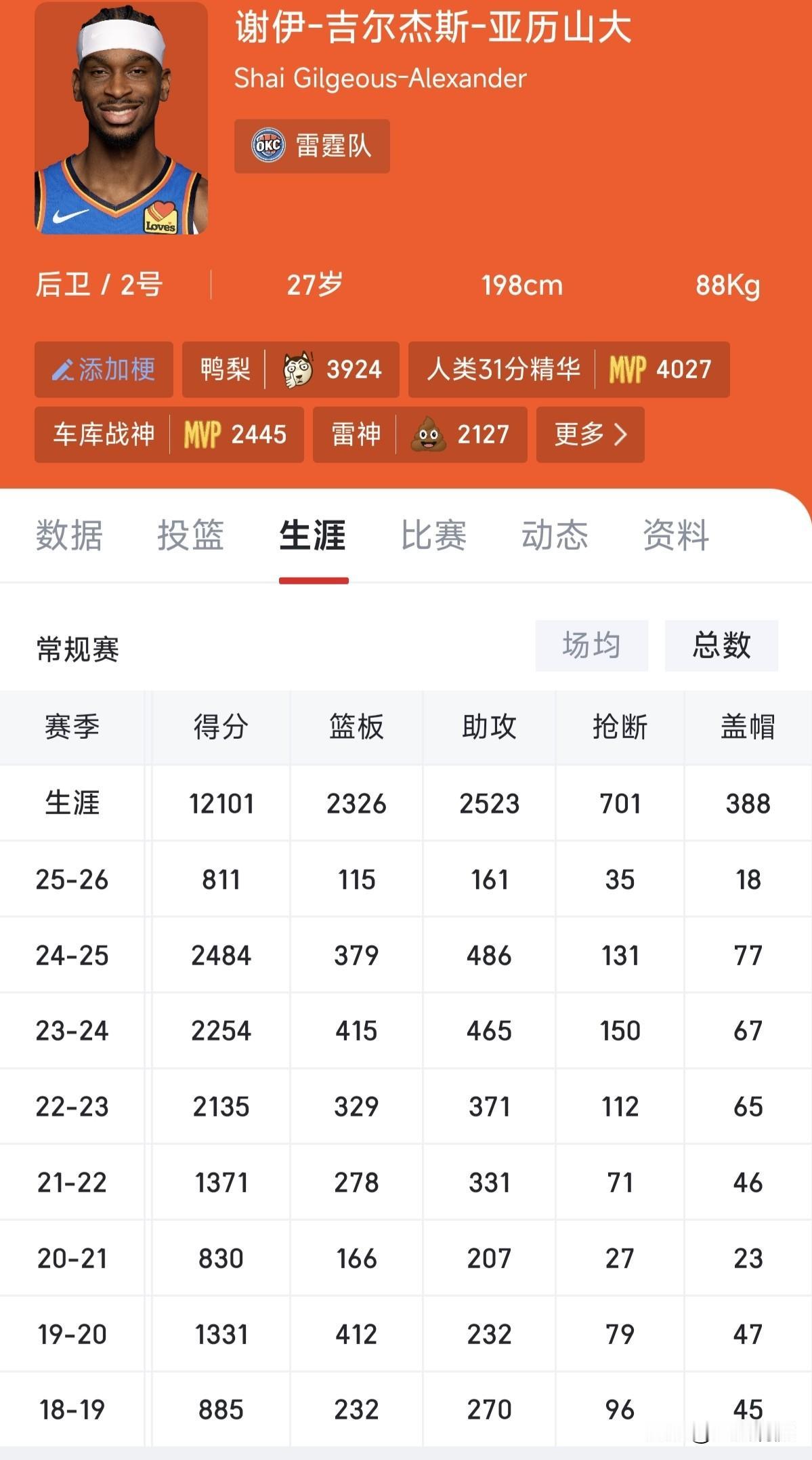 本赛季第一个拿到800分的球员来了,他就是目前场均得分第二,上赛季的MVP亚历山大,现在811分,也许下一场比赛就会超过他生涯最小得分赛季,他是目前唯一连续三个赛季都拿到2000分球员,本赛季只要不受伤病影响,再次拿到2000分也是没有问题的。