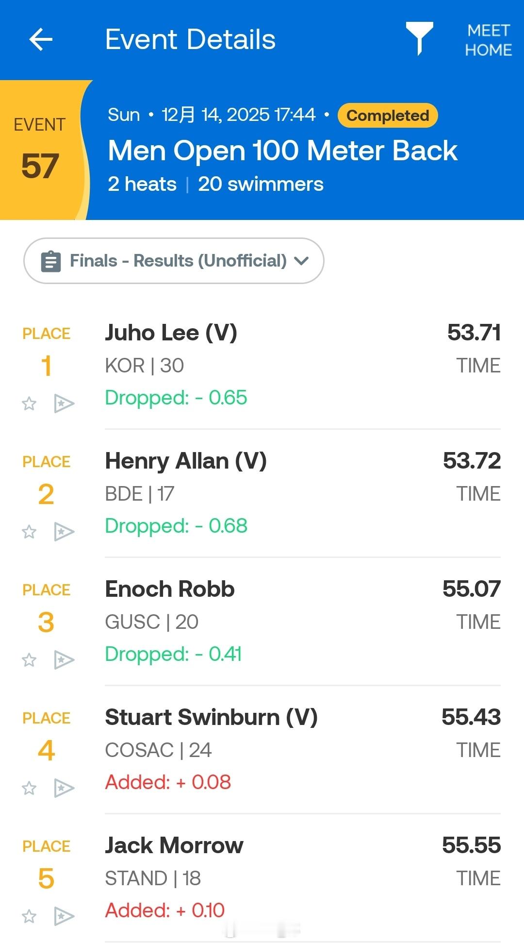 昆士兰州游泳锦标赛 男100仰决赛李周浩 53.71Allan 53.72