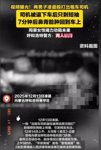 内蒙古呼和浩特,出租车司机为了解决温饱,深夜依然在跑车,车上有两名大约50岁的男乘客,突然情绪激动,他们不但辱骂司机,甚至还出手殴打司机,不但扯司机的头发,还抢手机砸他,他们嚣张扬言道:打你怎么了? 寒夜奔波只为碎银几两,司机的隐忍却成了施暴者嚣张的底气。扯头发、抢手机、暴力殴打,这哪里是乘车,分明是借着年长的幌子肆意霸凌。司机求的不过是平安送达、安稳谋生,却平白遭受身心双重伤害,连“好好开车”这个简单诉求都要被践踏。 施暴者或许觉得“打一下而已”,却不知这种无故伤人的寻衅滋事,既逃不过拘留罚款的法律制裁,更寒了所有劳动者的心。职业无高低,凭劳动谋生的人都该被尊重,出租车司机不是任人拿捏的软柿子,法律更不会纵容这种恃强凌弱的恶行。 尊重从来都是相互的,你善待为生活打拼的人,也是在善待未来的自己。你觉得该如何更好地保护出租车司机等户外从业者的安全?来评论区聊聊~