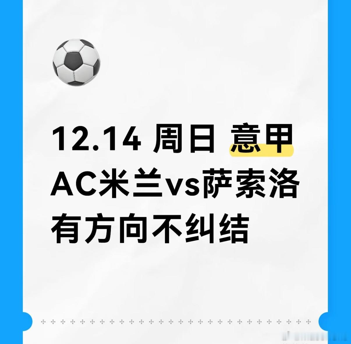 今晚信心非常充足,势必带着家人们畅爽一波!队伍:鹿斯巴达vs海伦芬风速:让胜粉笔:00 10 11———————————队伍:AC米兰vs萨索洛风速:胜胜粉笔:20 30 41