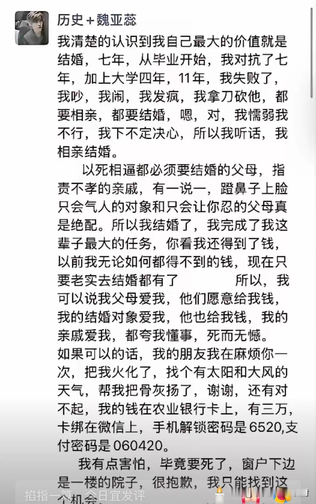 看完河南鲁山那个新娘的遗书,真的是给所有未婚女性提了个醒。这哪是结婚啊,分明是把人往绝路上逼。那男的得寸进尺固然可恨,可真正压垮魏老师的,恰恰是父母那句“为你好”。 今天看到说男方拿钱侮辱人。男方太倒霉,谁家的钱也不是大风刮来的,出钱出力惹晦气,遇到这种极端女。 不能批判她父母,中国父母都希望子女能早日成家,只怪女孩喝毒鸡汤太多。这些当今中国的社会问题,不婚不育看似是自己的事情,实际上是对家庭,对国家,对社会,对民族的不负责任。 有死的决心却没有离家出走的勇气?断掉一切联系方式,到一个陌生的地方重新开始,按照你自己的想法活啊。 怪男方干嘛呢?人家逼着她结婚的吗?男方才是最可怜的,花了钱人死了,自己还变成了二婚。 不能批判她父母,中国父母都希望子女能早日成家,只怪女孩喝毒鸡汤太多,处理问题极端化。
