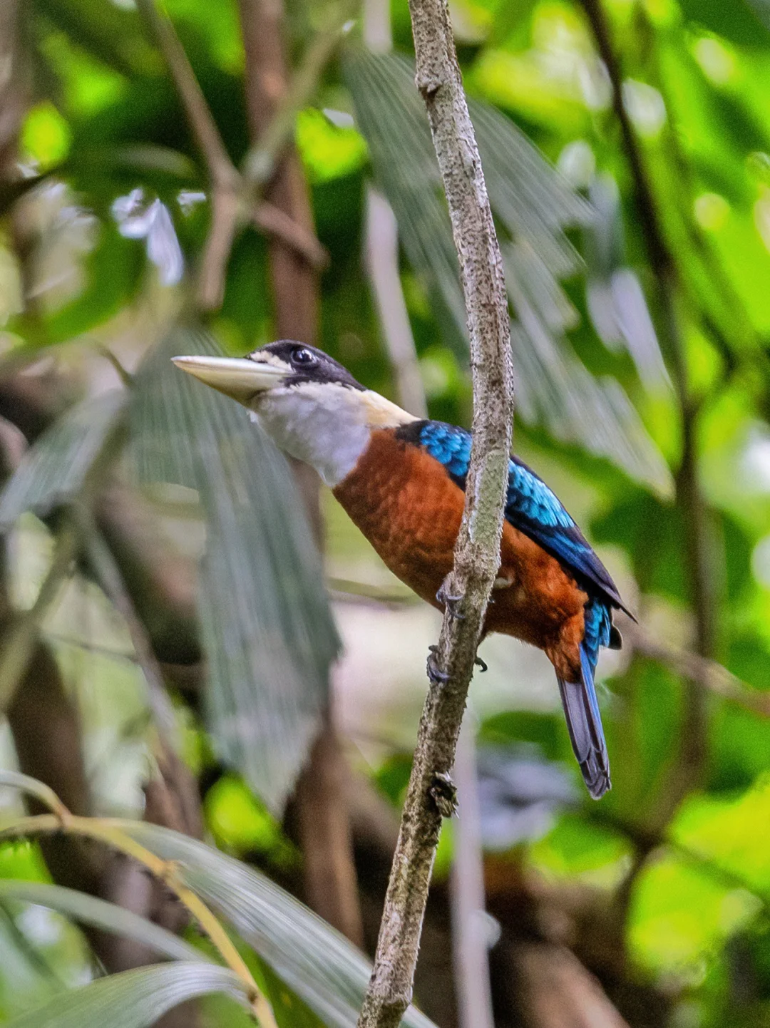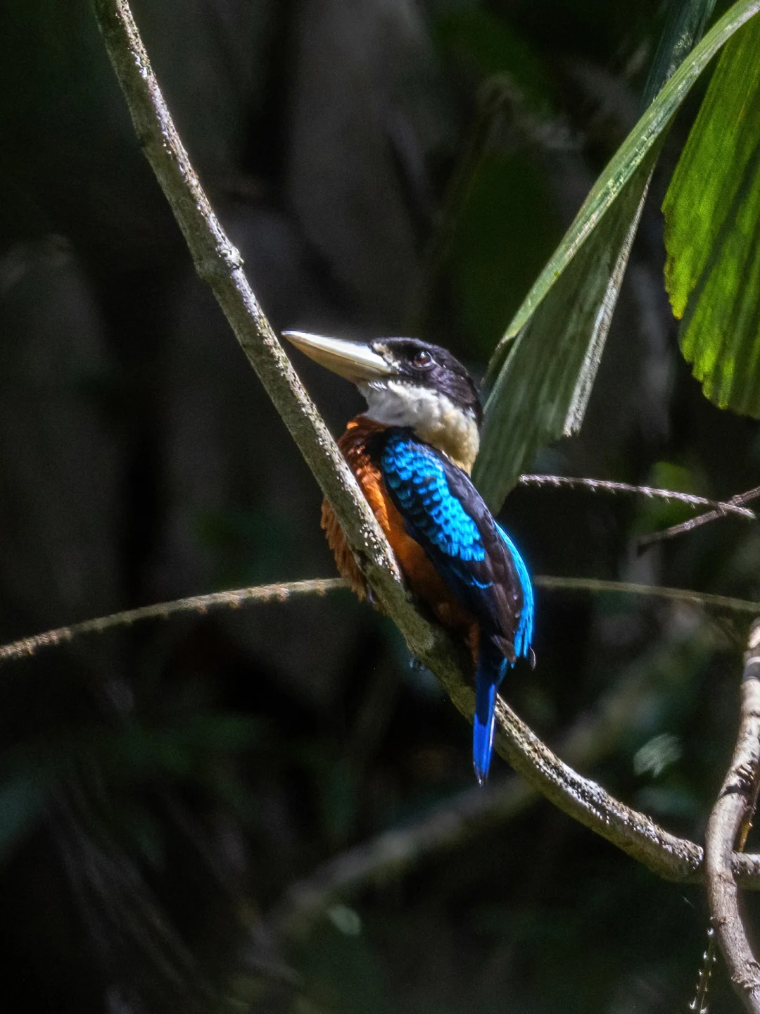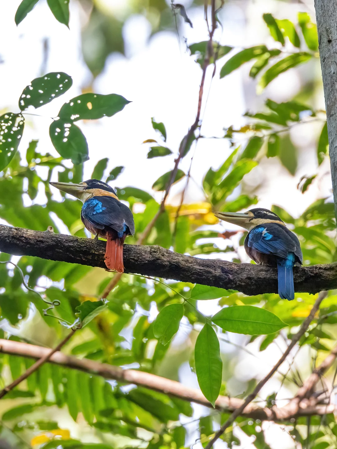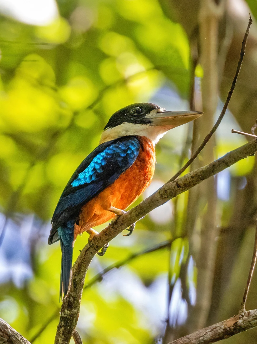 棕腹笑翠鸟以其独特的外观著称,拥有黑色的顶冠、蓝色调的翅膀、鲜明的肉桂色腹部和尾羽。雄鸟具有白色的颈环,尾巴是蓝色的。雌鸟和幼鸟的尾羽是红褐色,如图6。