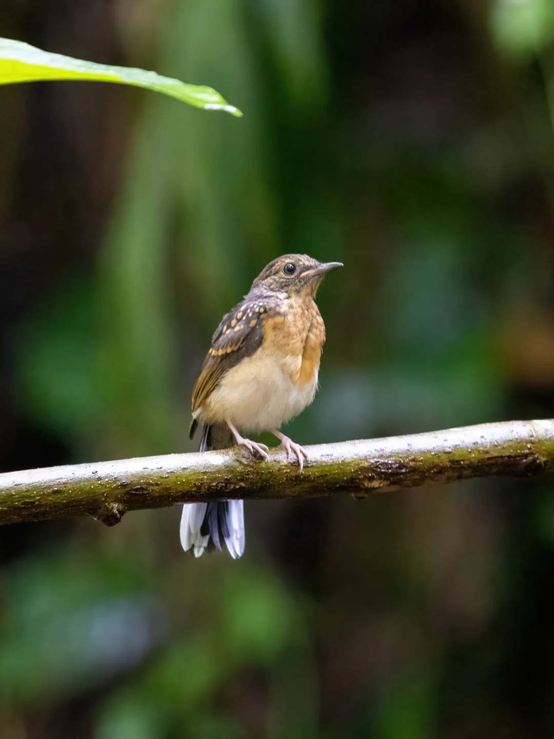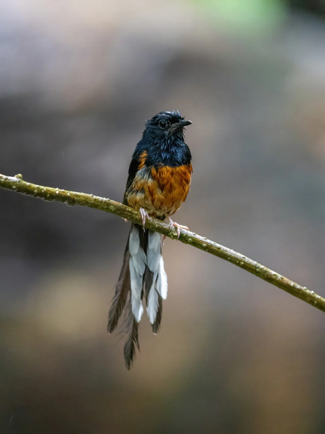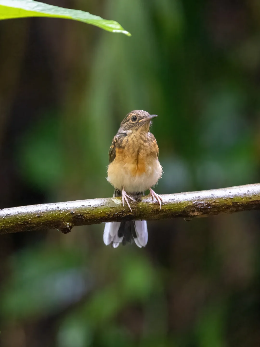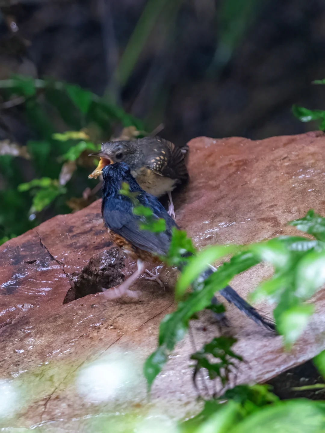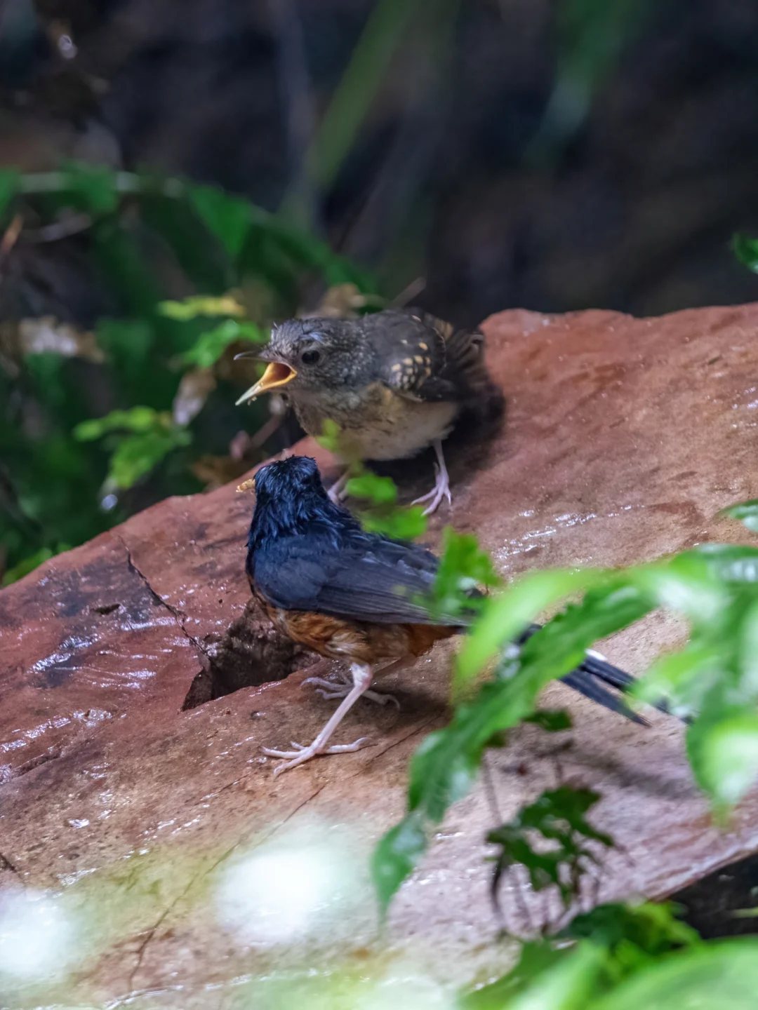 原创拍摄于2024.07 白腰鹊鸲,雀形目鹟科鹊鸲属。是一种尾巴更长,颜色更红的鹊鸲,特别是雄鸟,背部有光泽,胸腹部为栗红色,有白色腰。跟分布在全国各地比较常见的鹊鸲不同,白腰鹊鸲在我国只分布在很南的热带地区。 在观鸟时突降大雨,没想到这只白腰鹊鸲爸爸仍然冒着暴雨给幼鸟宝宝喂食(图123)。这只幼鸟宝宝已经离巢,不过仍然需要父母喂养一段时间才能独立(图4图5)。而这只白腰鹊鸲爸爸在大雨中淋成了落汤鸡(图6),真是让人感叹父爱的伟大。