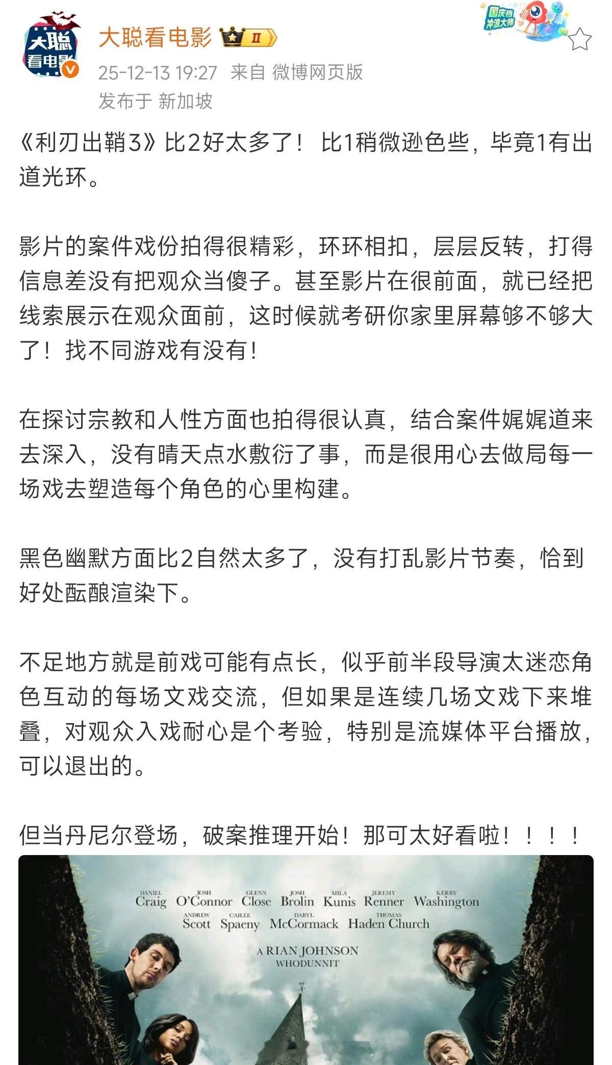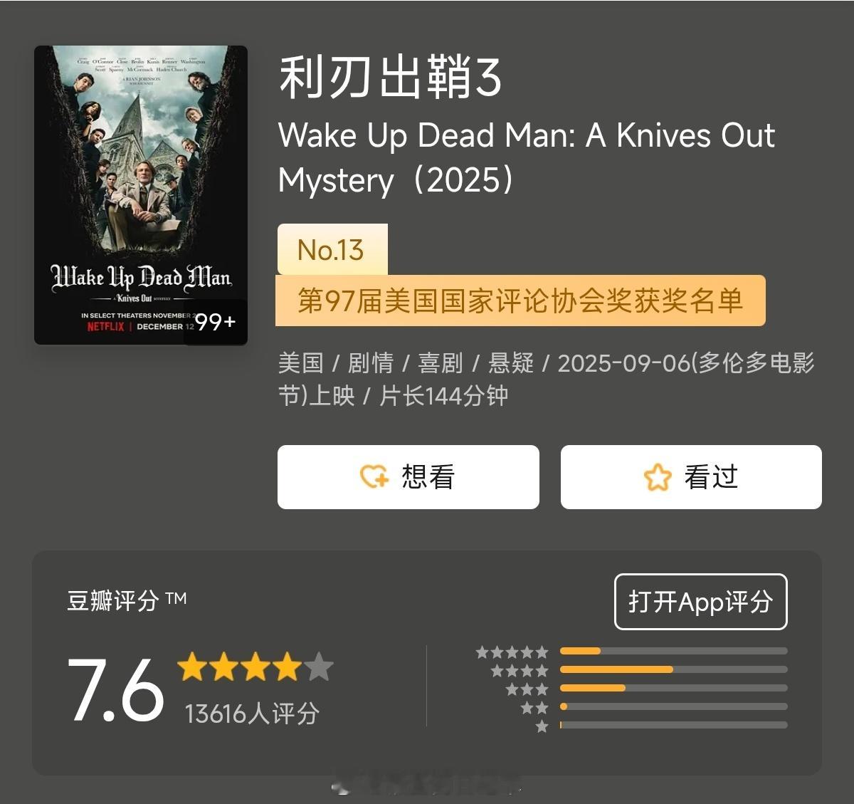 听说利刃出鞘3 评价不错,下好了准备今晚看看。(话说有NAS后,我只下载杜比视界版本了懒酱看剧