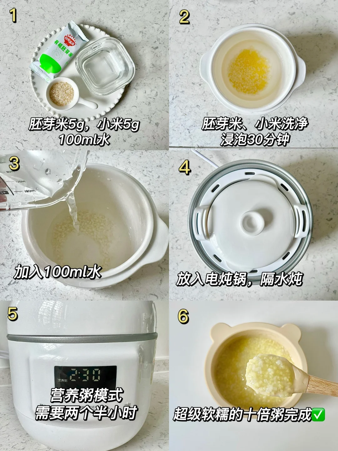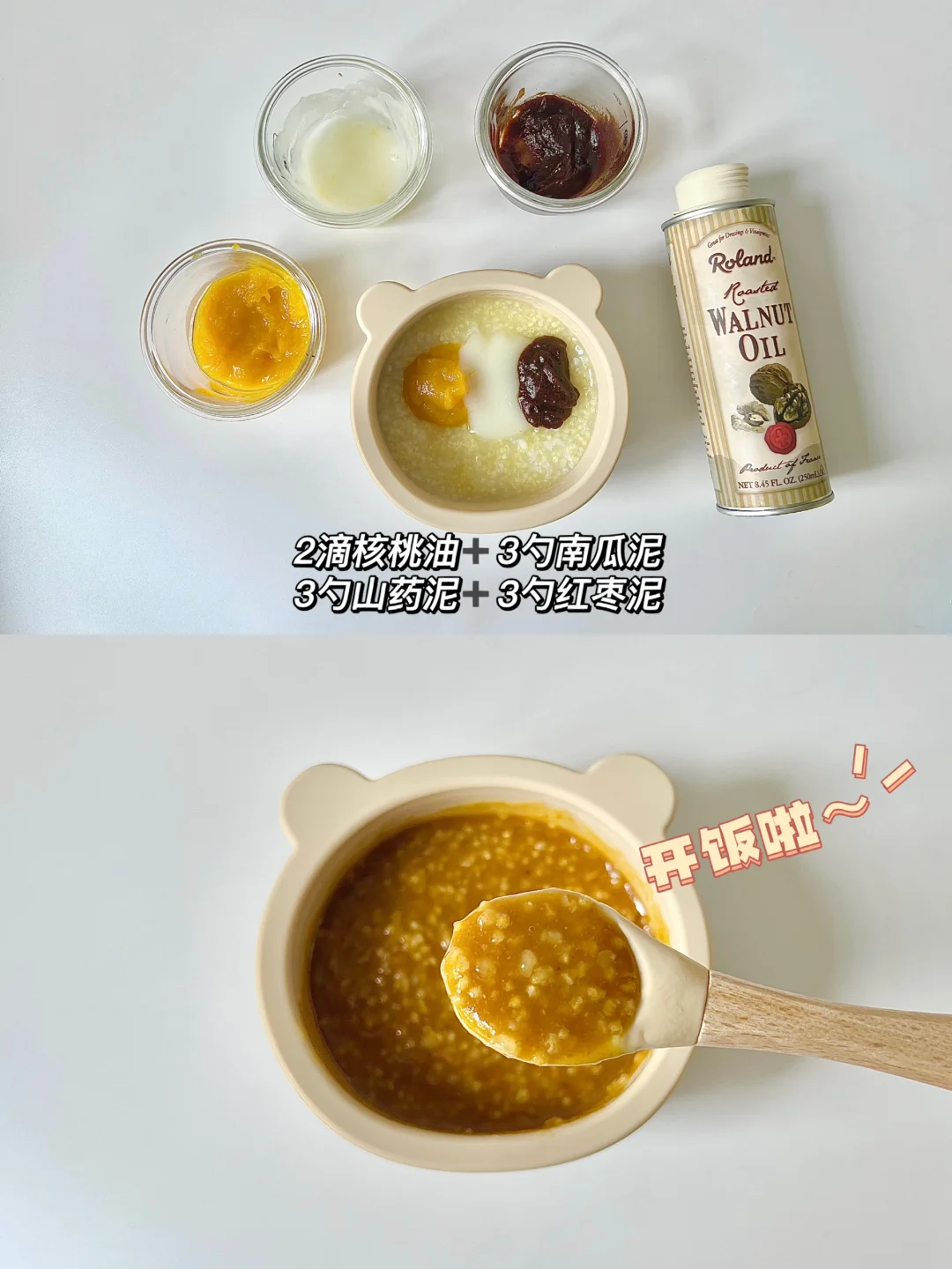 📝:5g胚芽米➕5g小米➕100ml水➕2滴核桃油➕3勺山药泥➕3勺红枣泥➕3勺南瓜泥