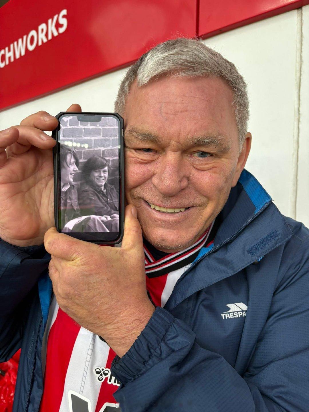 【一生中最爱!真死忠球迷】英超东北德比,桑德兰vs纽卡斯尔联,光明球场,有位68岁老球迷,打开手机的相册,向媒体展示一张老相片:1973年,他16岁那一年,在哥哥的带领下,第一次来看到光明球场看东北德比。52年后的今天,他依然坚守对黑猫的热爱,这是他一辈子支持的球队。