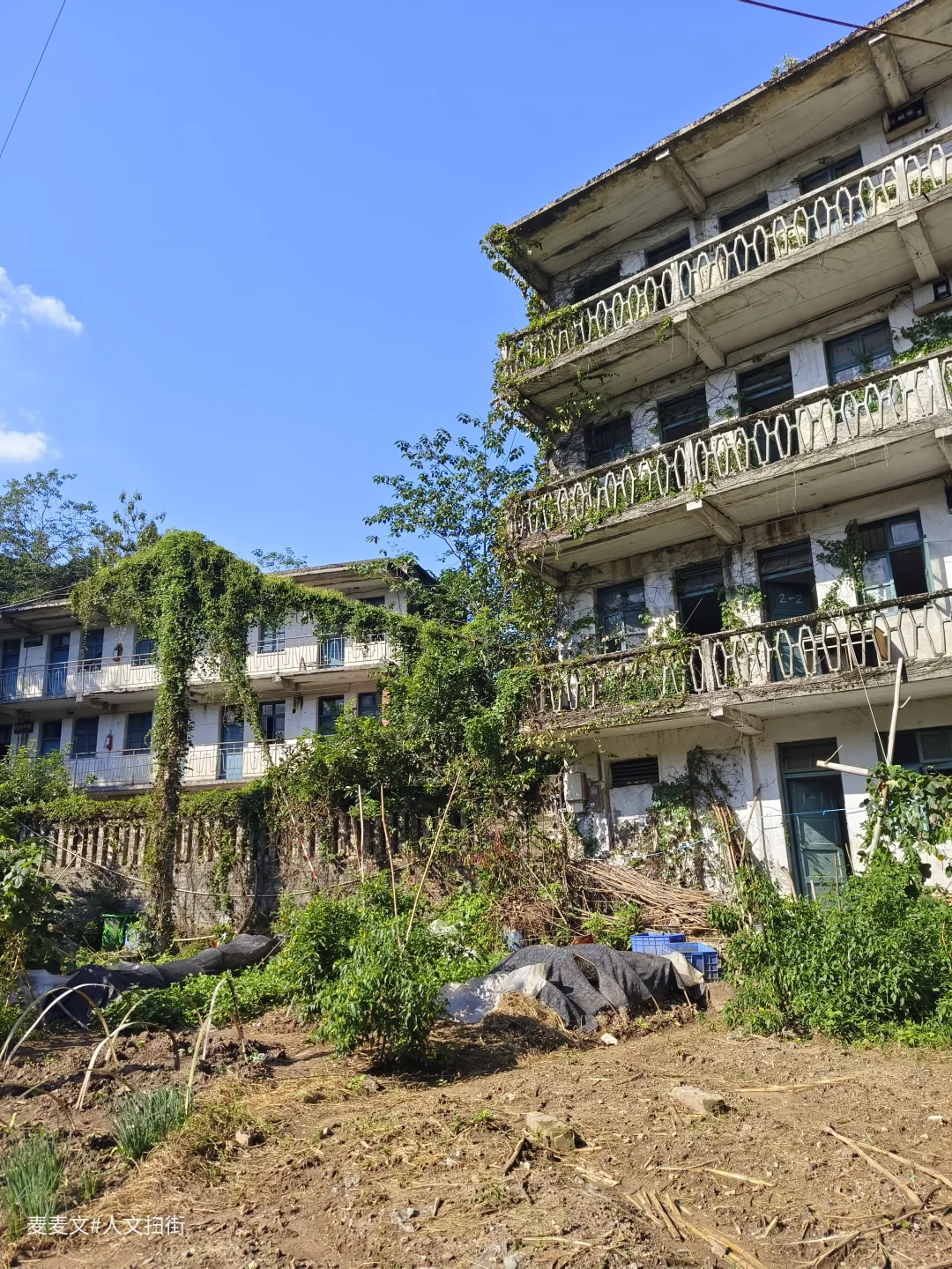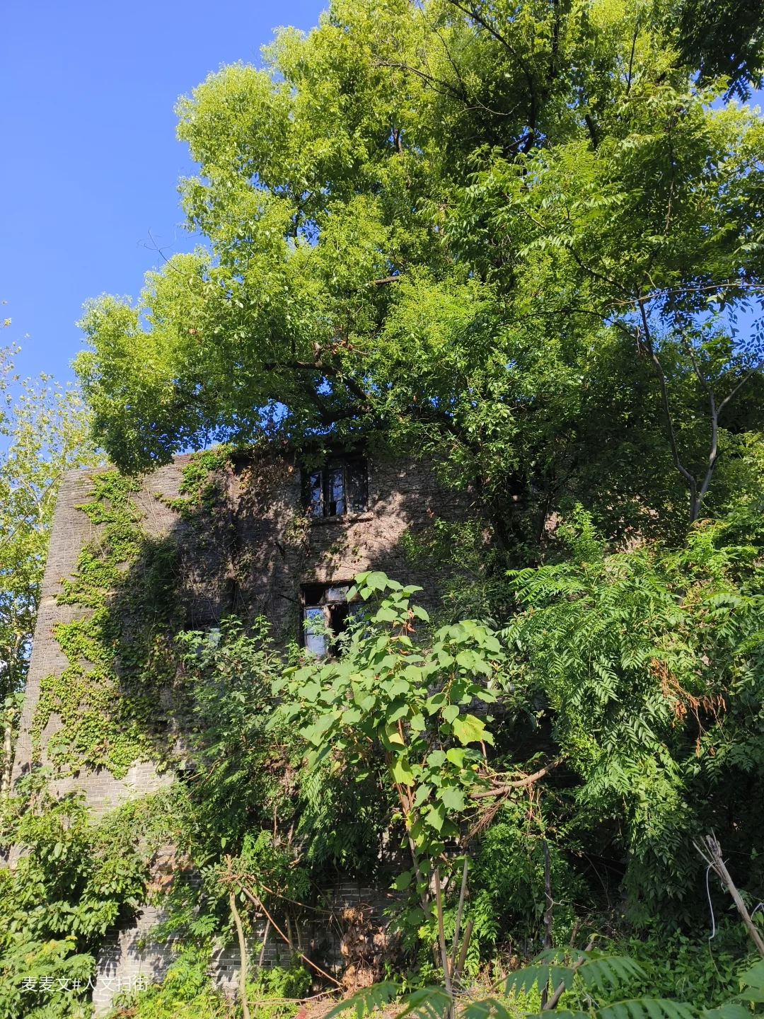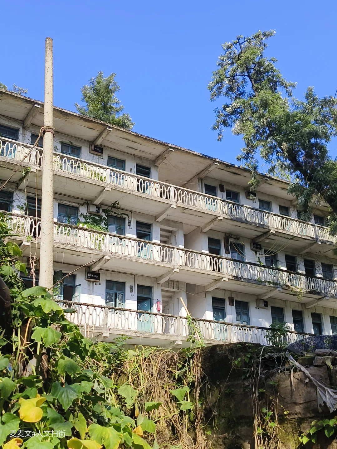 上周末去重庆北碚扫街,偶然发现了一处像是废弃学校的地方。操场的篮球架孤零零地立在那里,篮板布满裂痕。几栋爬满藤蔓的楼房,斑驳的墙体诉说着岁月的故事,藤蔓沿着镂空阳台栏杆肆意攀爬,仿佛想要将时光挽留。这栋被绿植簇拥的老楼,在蓝天的映衬下,静谧而又沧桑。曾经,这里或许充满着欢声笑语、烟火日常,而如今,它像是一位沉默的长者,独自回味着往昔的热闹与温情,静静伫立在大沱口这片天地间,成为记忆里一抹独特的风景。