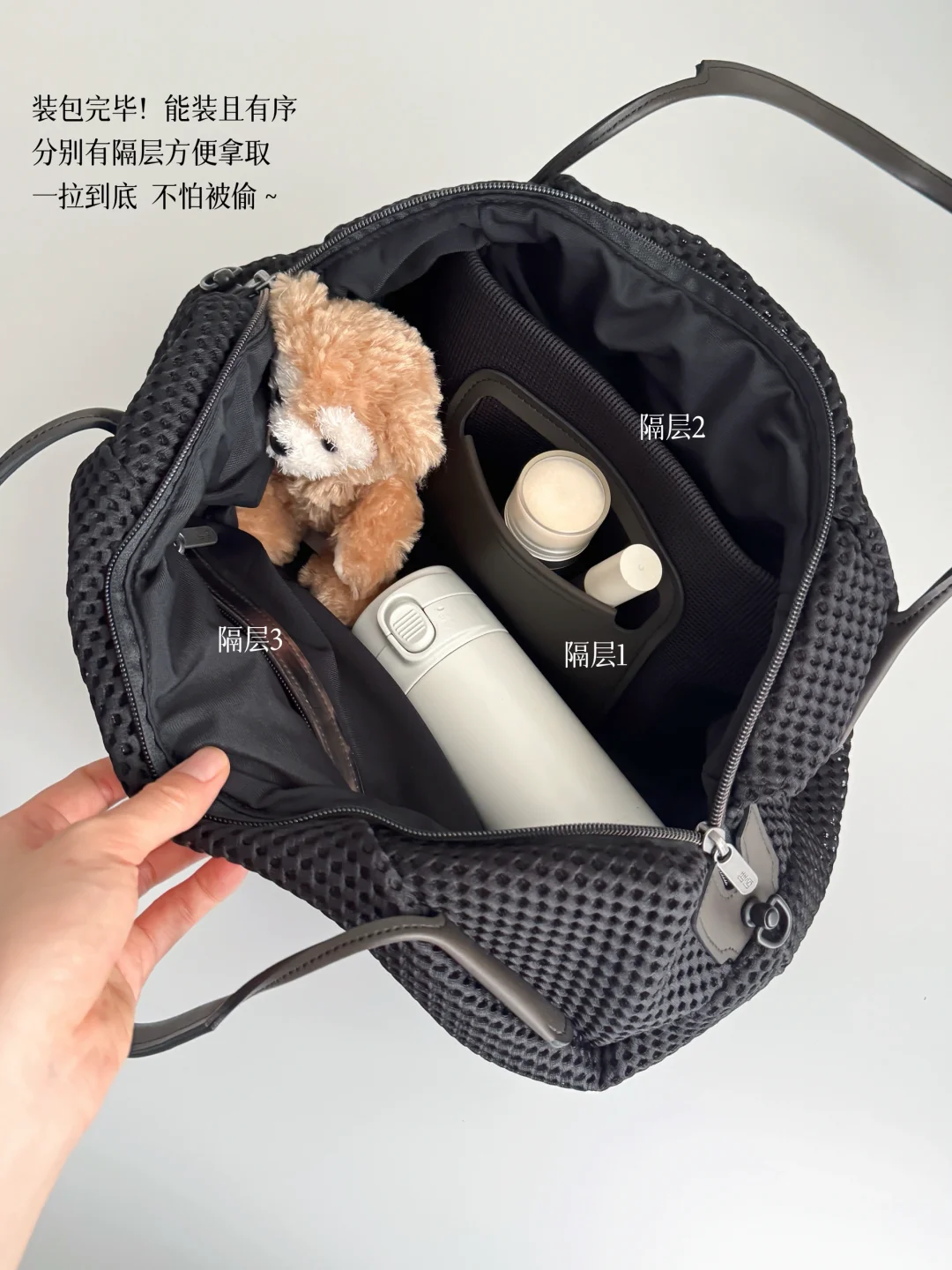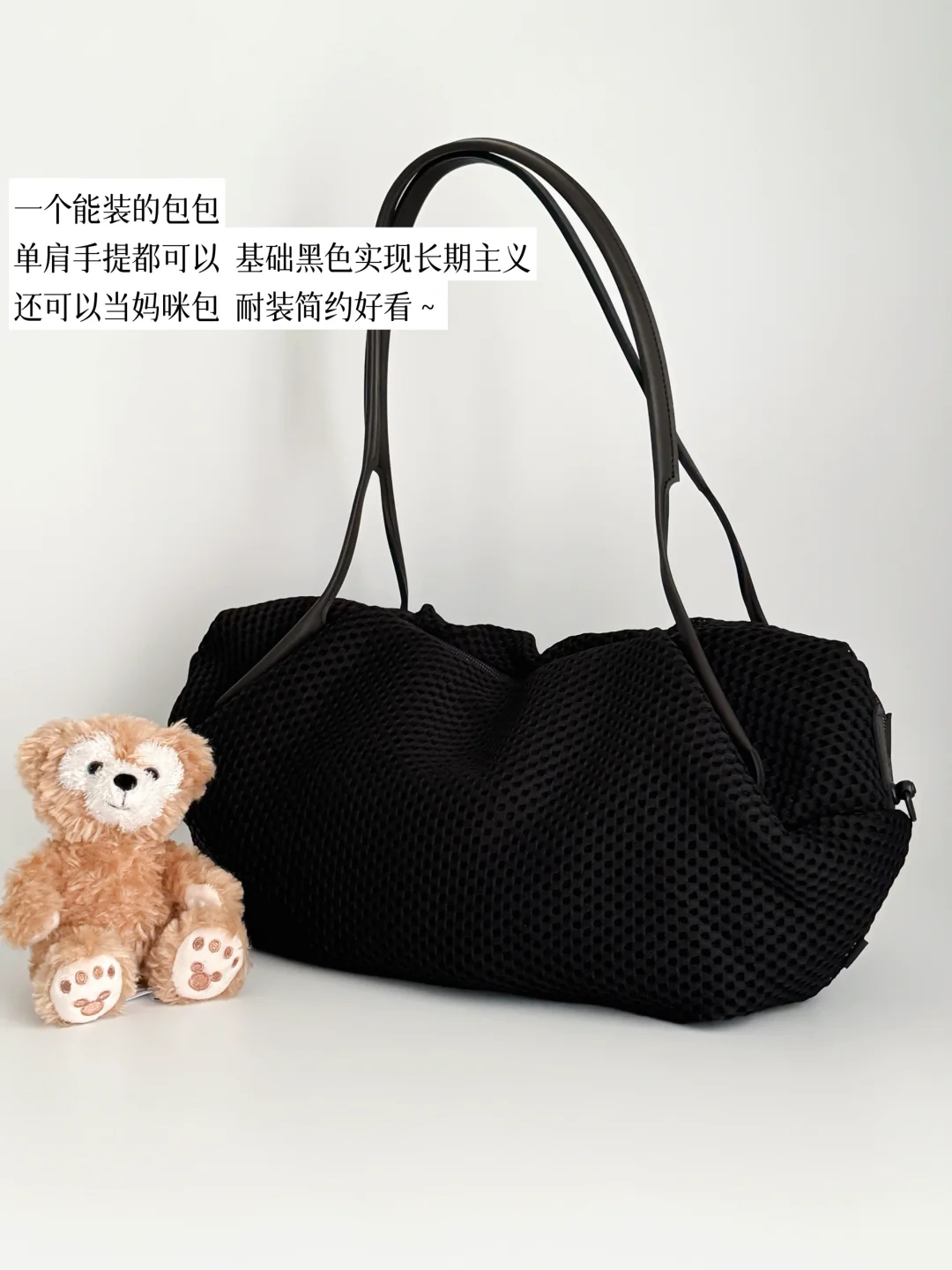 一款可单肩可斜跨的黑色包包,不仅能装,肩带不勒,自重轻,随便出门怎么搭都方便。