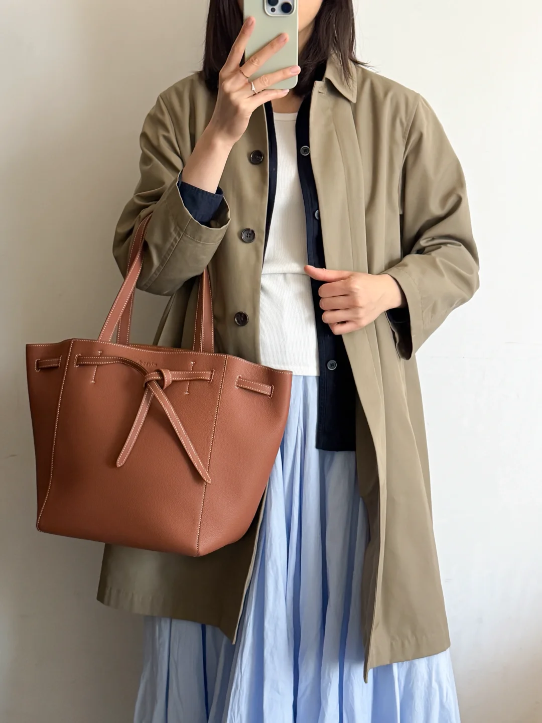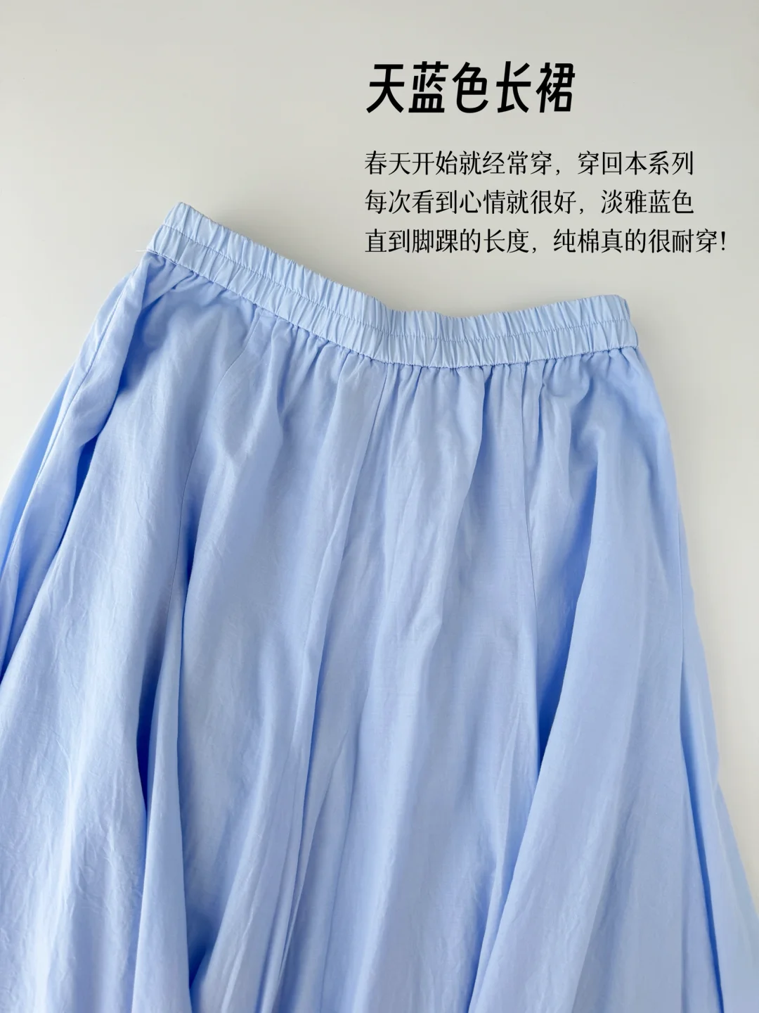 春天开始就经常穿,穿回本系列。每次看到心情就很好,淡雅蓝色,直到脚踝的长度,纯棉真的很耐穿!