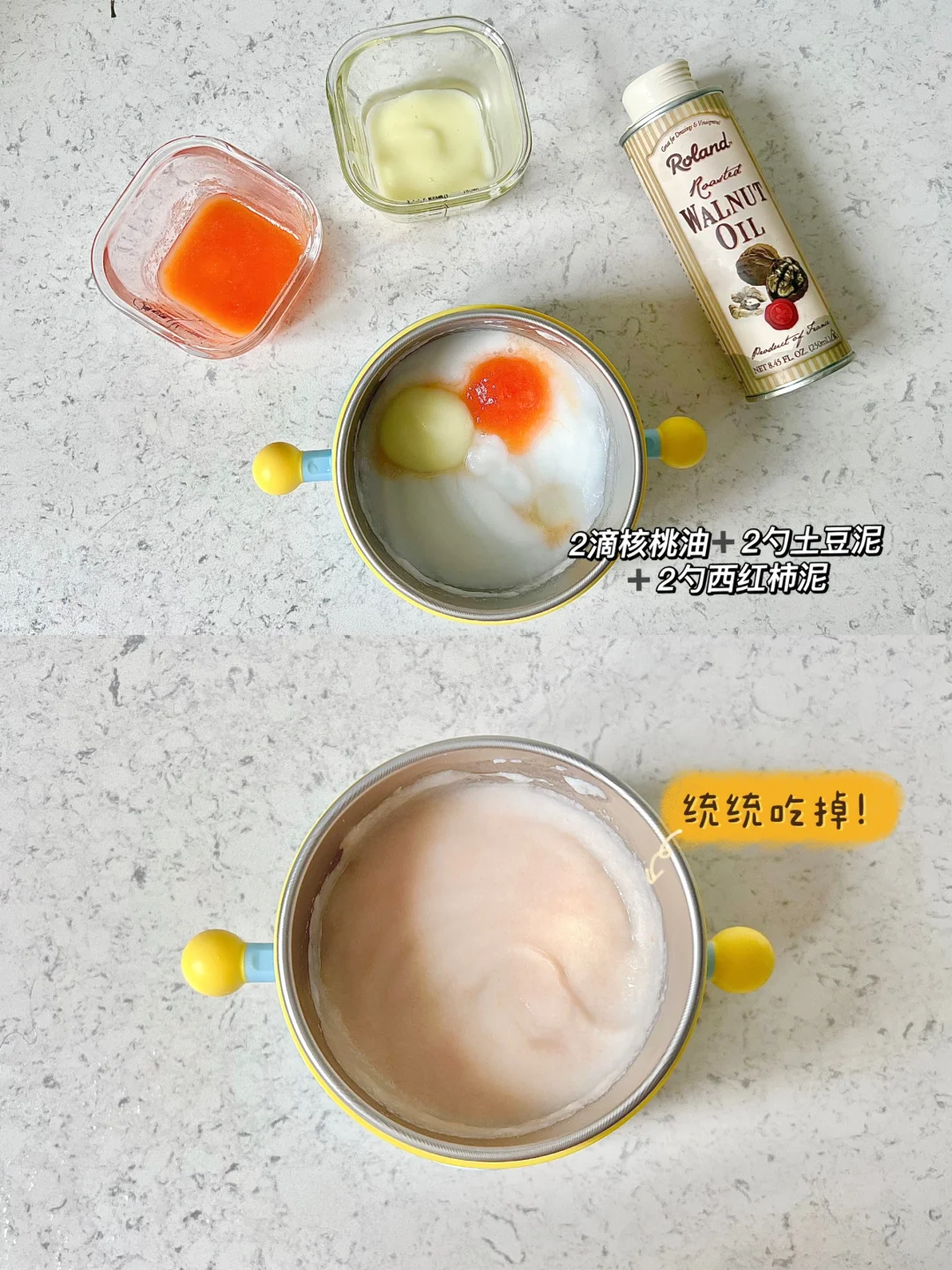 👧:6个月➕21天 🥣:高铁米粉➕核桃油➕西红柿泥➕土豆泥 ⏰:上午11:30 📝:7.5米粉➕70ml水,2滴核桃油➕2勺西红柿泥➕2勺土豆泥 🍽️:下午加餐橙子🍊 昨天加餐西红柿,没有不良反应,今天加了之前排过敏的土豆泥一起吃,今天一整碗吃光光,下午加餐橙子🍊,放进咬咬乐吃,可以锻炼一下柒柒的咀嚼功能。
