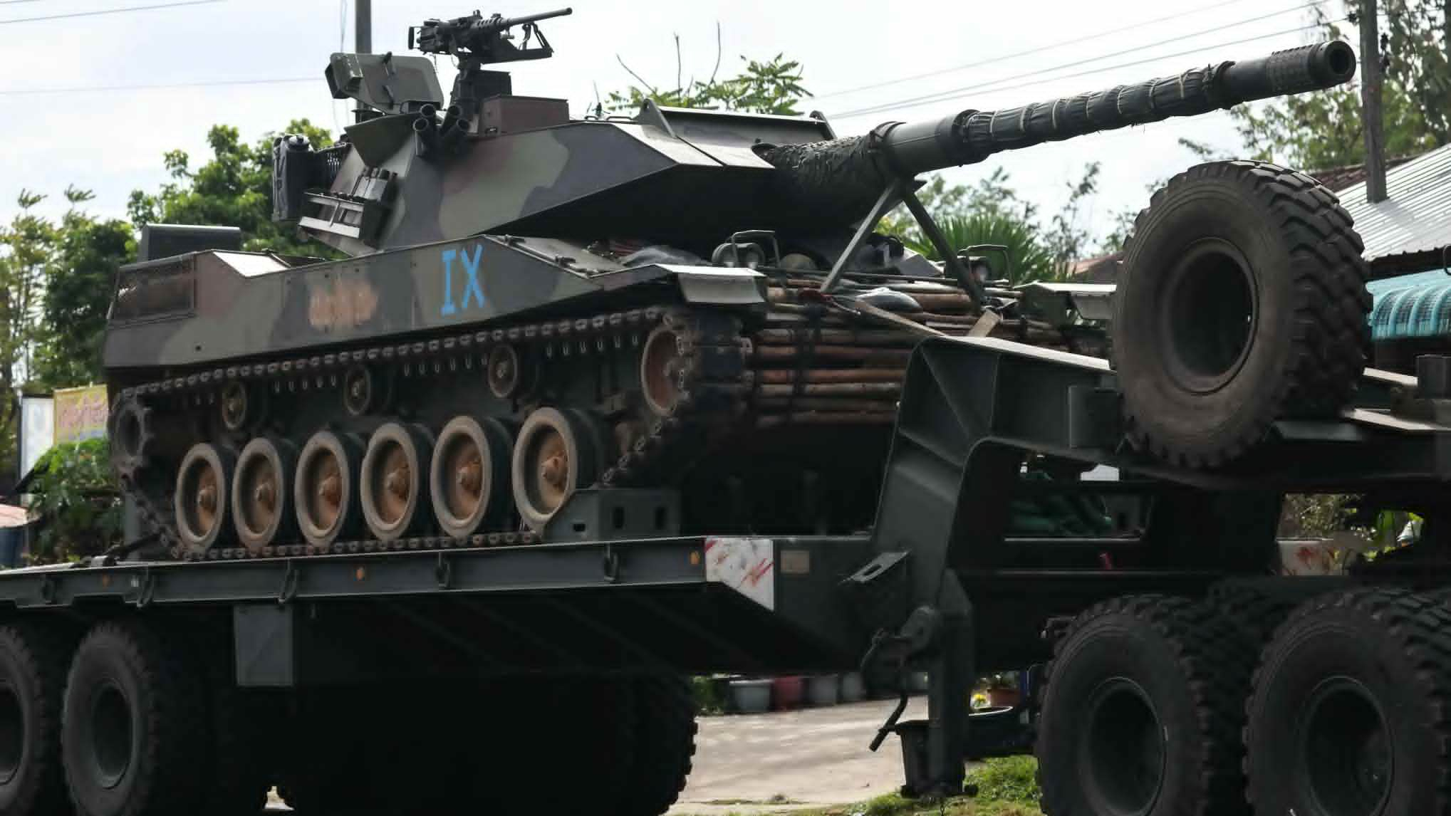 泰柬冲突 泰军通过拖车向前线部署魟式轻型坦克,车体前面还绑了一捆棍子,这是打算作为附加装甲使用么。整体看保养得还不错。