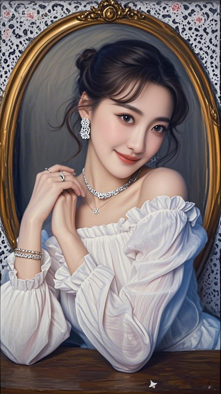 优雅复古风,镜中美人,精致妆容,复古耳环,珍珠项链,浪漫氛围。