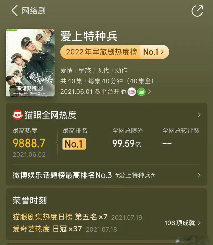 这谁的粉做得,2021年播放量年三,猫眼热度年冠,爱奇艺现偶史冠的《爱上特种兵》,是下降作品,多少人想要一个热播期6000多万播放量的成绩。 还有2020年偶像剧年冠军《幸福触手可及》6000万播放量被吃了吗?超过5000万作品不显示?