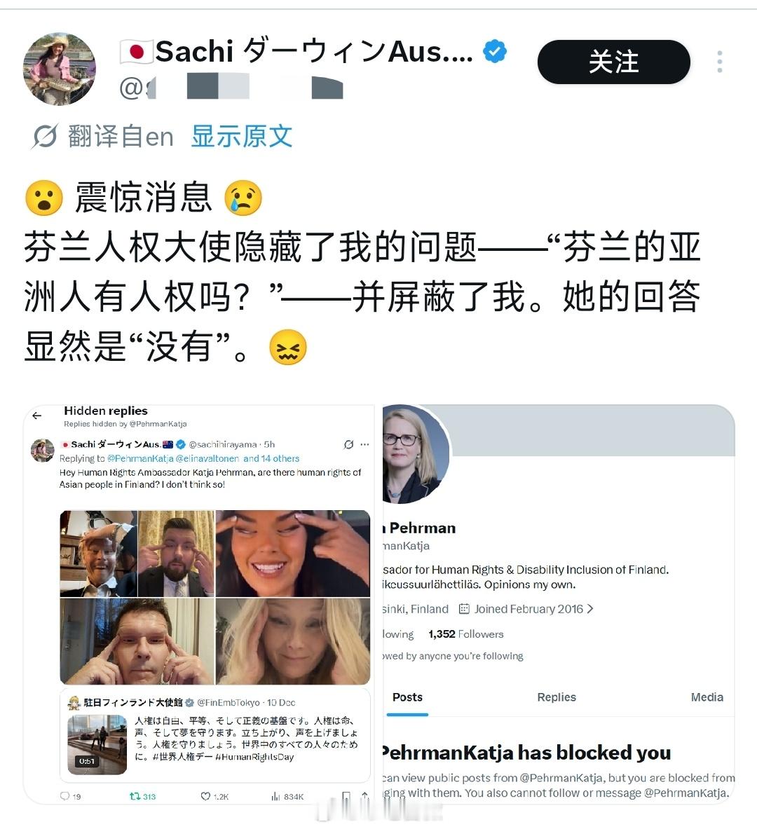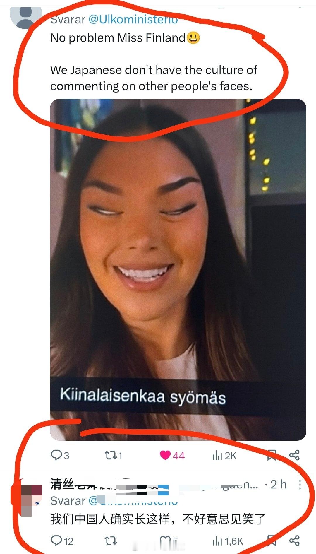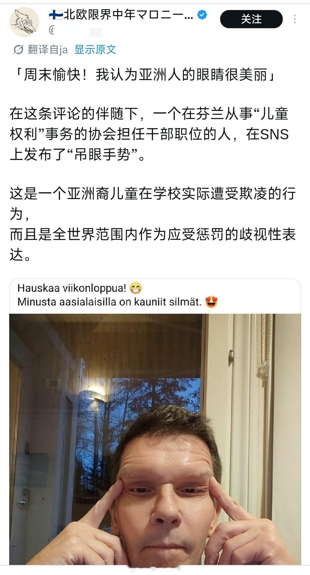 芬兰小姐因为做出“眯眯眼”歧视动作被撤掉头衔,芬兰的官员也做出对应的动作表示支持,结果大量日本人出征芬兰驻日大使馆,反贼却在支持芬兰人的歧视手势,实在是很难评。⭐亚洲人同心协力反对西方的种族歧视是应该的,至于那些唱反调的反贼,已经不能被称为人了。芬兰官员公然发布眯眼照片