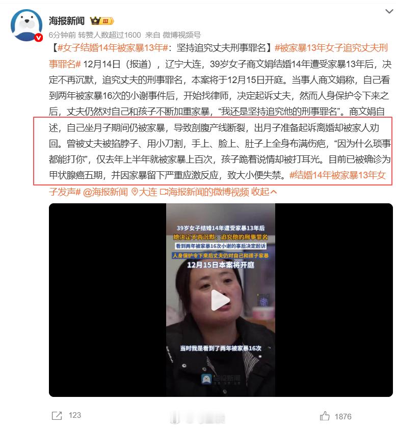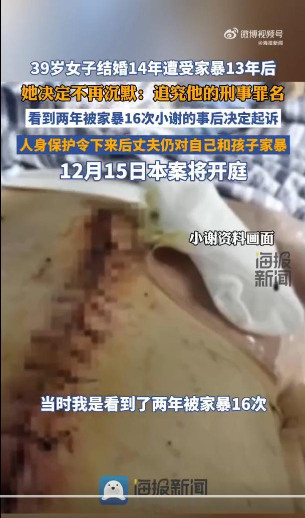女子结婚14年被家暴13年 所以,我个人一直觉得要舍弃家暴这个法律词汇了。哪有什么家暴?就是故意伤害罪。假如第一次殴打就按人身伤害来处置,就不会有女子后面被打得浑身都是伤疤、大小便失禁,还有那场连续下了13年的雨…