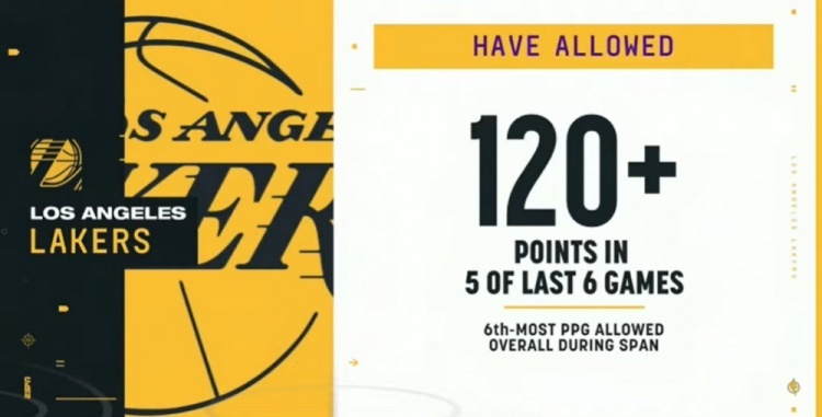 急需一场胜利!湖人最近6场比赛,5场让对手得到120+,战绩3胜3负。