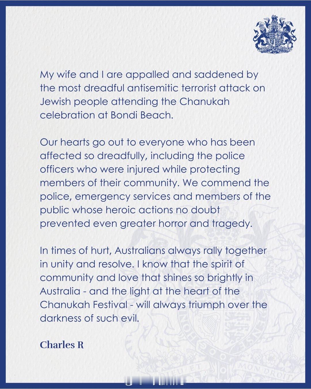 英国王室 今天澳大利亚邦迪海滩发生枪击案,查尔斯三世作为澳大利亚君主发表慰问信息🇦🇺