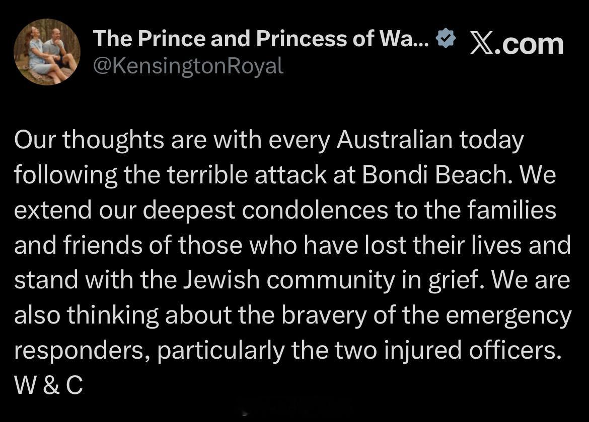 威廉王子 就澳大利亚海滩枪击案,肯辛顿宫紧接着发表威尔士亲王夫妇的慰问信息🇦🇺📍W&C代表William和Catherine。