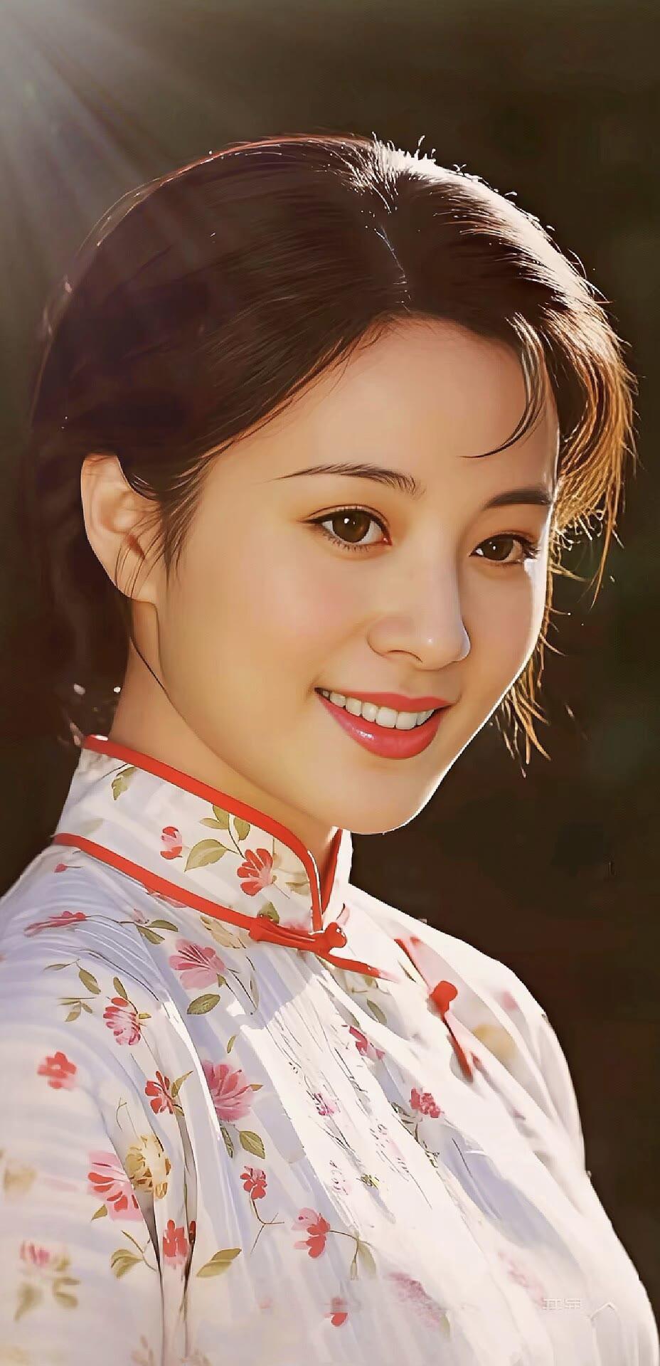 温柔甜美的微笑,红唇与黑发的完美搭配,散发着迷人的魅力。
