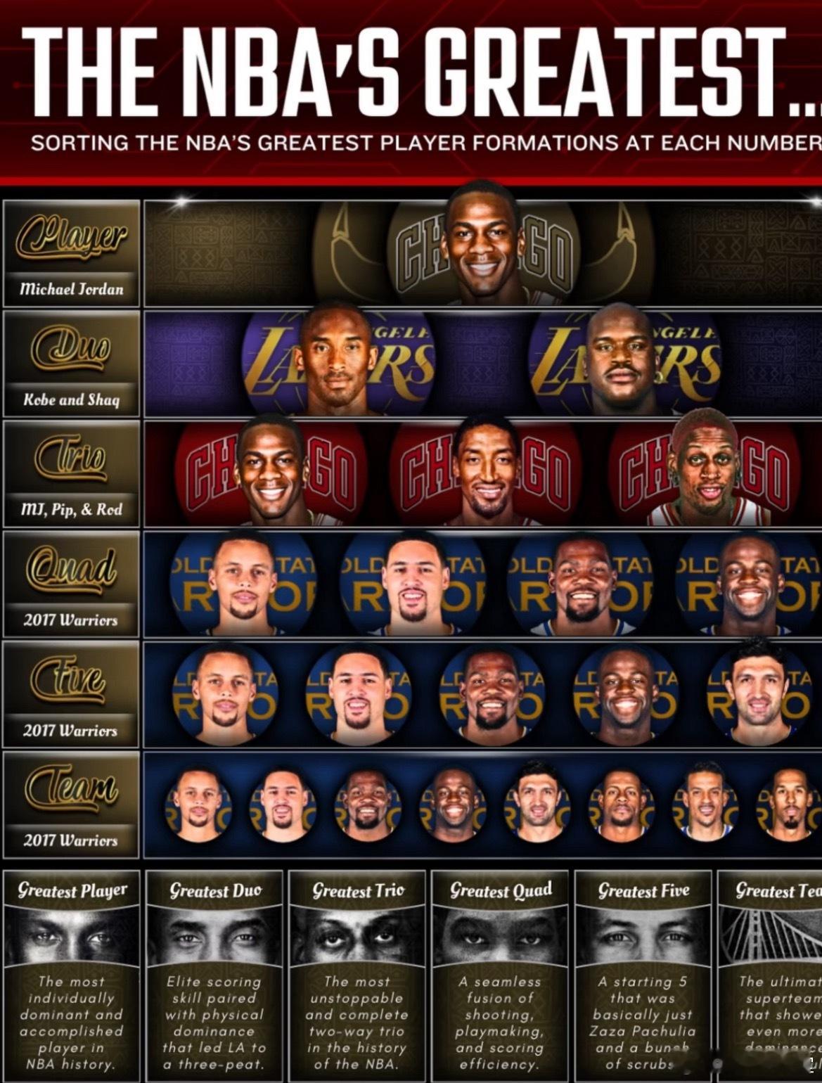 头次见!从1到5美媒给出的最伟大名单同意吗球员:乔丹双人组合:科比和奥尼尔三人组:乔丹、皮蓬和罗德曼四人组:斯蒂芬、克莱、KD和追梦五人组:2017勇士全队成员:2017勇士