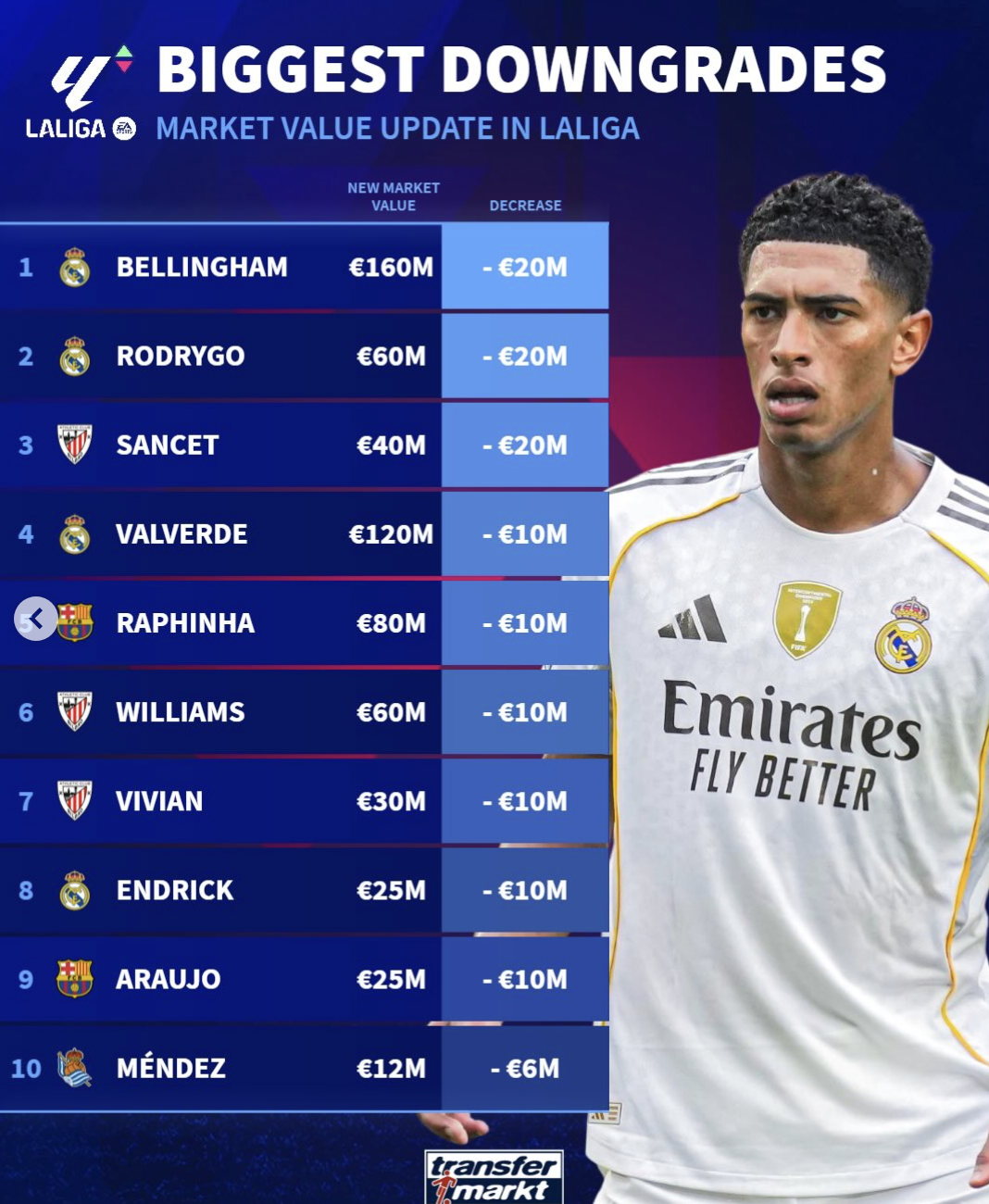 皇马的贝林厄姆和罗德里戈,以及毕尔巴鄂的桑塞特身价均下跌2000万欧,成为最大输家。