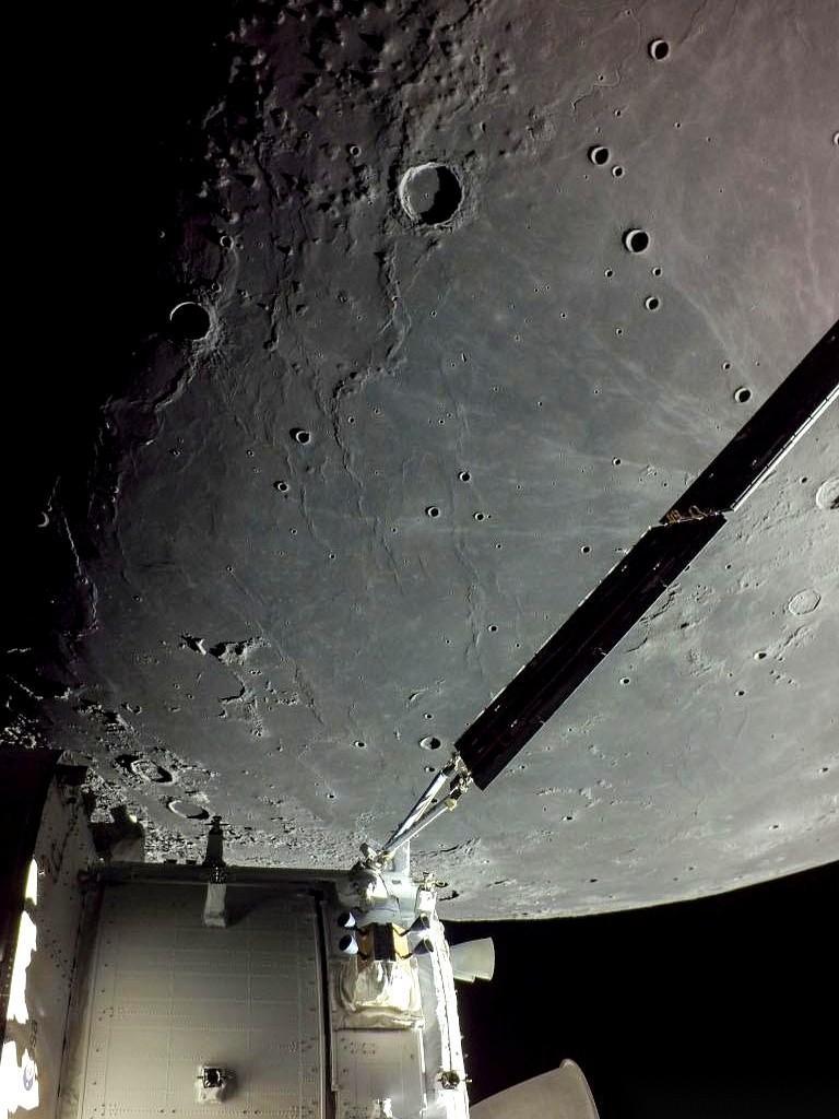 一艘没人的飞船,在回家之前,回头又看了一眼月亮。 就拍下了这张照片。 那个伸出来的“翅膀”,是它的太阳能板,是我们人类留在画面里唯一的签名。除此之外,全是宇宙级的寂静和荒凉。 脚下那片又黑又光滑的地方,有个巨浪漫的名字,叫“风暴洋”。 哪有什么洋,就是一大片早就冷却凝固的熔岩海。但你就觉得,这名字起得真好,里面像是藏着千军万马的故事。 那条白天和黑夜的分界线,干净利落得像用刀切开一样。一半光明,一半是能吞噬一切的黑暗。 有时候你看这种照片,真的会恍惚。 觉得人类真渺小啊,一粒沙子都算不上。 但又觉得人类真TM牛逼啊,我们居然真的能把一个没人的铁疙瘩送到那儿,让它安然无恙地飞过,还拍下这么一张“遗照”似的照片,再稳稳当当地回家。 它不是去旅游的。 它是去探路的。 为我们,为后面那些真正要坐上这艘船、再次踏上月球的人,去踩个点,趟个险。 这张照片,其实就是一张请柬。 来自星辰大海的请柬,上面写着一行小字: “嘿,准备好了吗?”