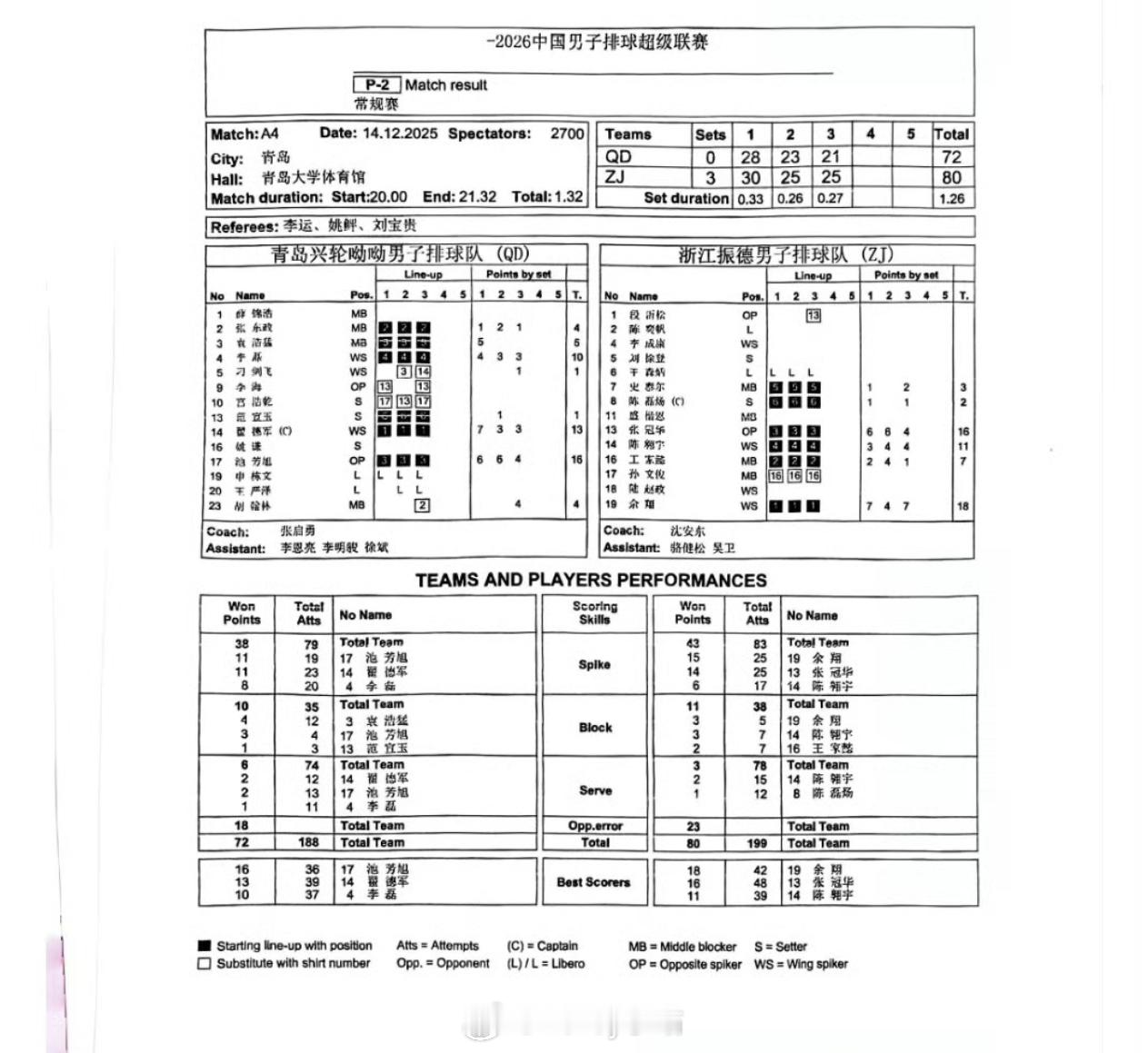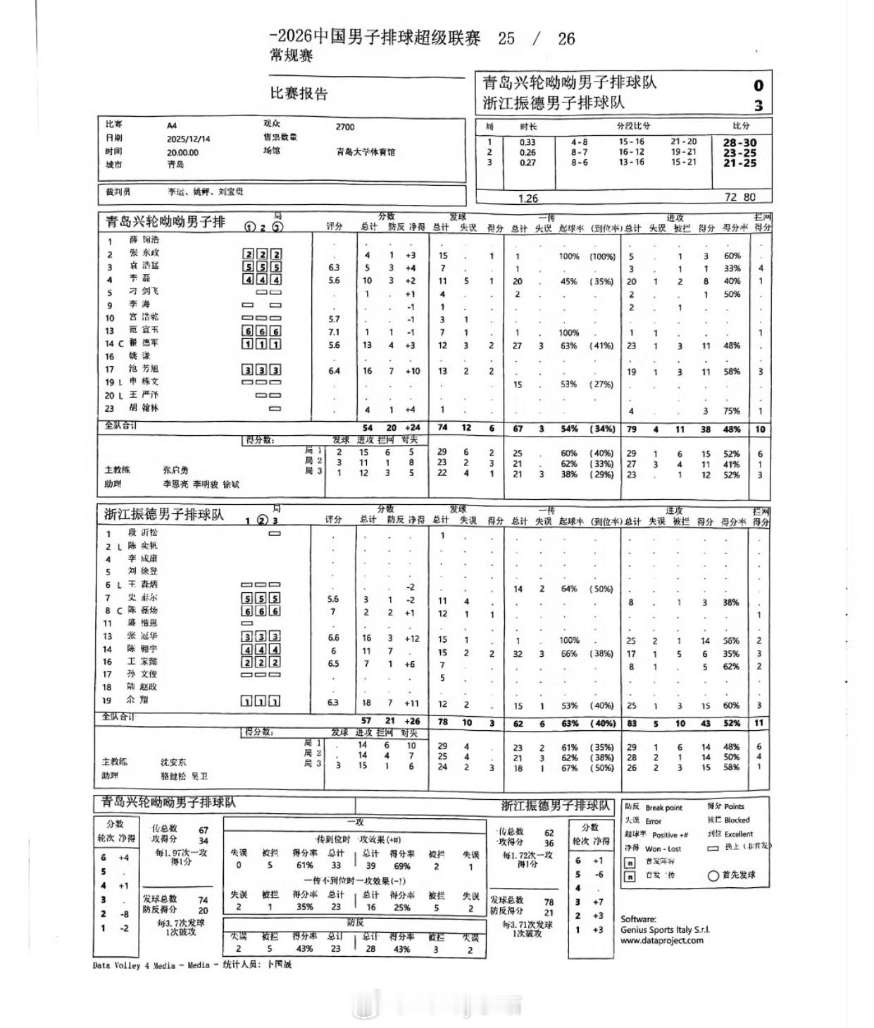 浙江男排3比0山东男排详细技术统计排超联赛2025-2026中国排球超级联赛