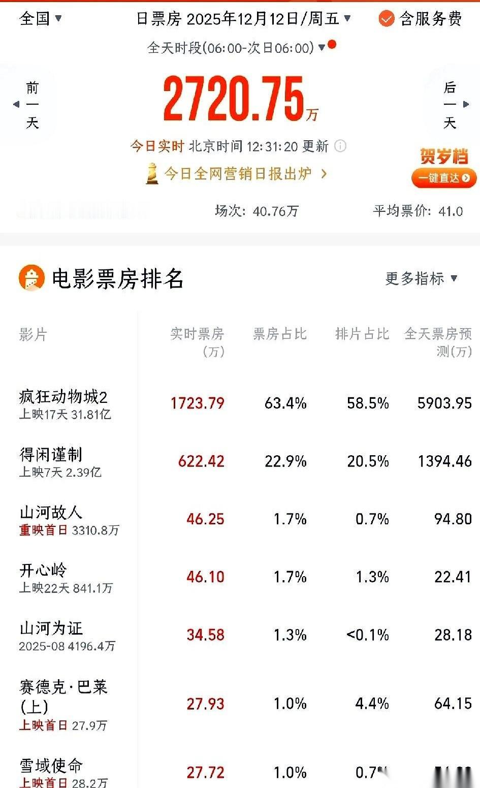 1700多万! 我的天,这还只是周五上午啊,一部动画片,一上午干了一整天的活儿。 怪不得办公室里带娃的同事早就心不在焉了,群里聊的都是“周末去看哪场”。 你以为周末的电影院是给咱们这些打工人放松的?别天真了,早就被“四脚吞金兽”们占领了。家长们哪有选择权,孩子一句话,不管《疯狂动物城》出到第几部,都得乖乖掏钱买票。 再看看第二名,600多万,挺稳的。但说实话,跟第一名比,根本不是一个量级的选手。一个是核动力航母,另一个最多算个精装修的游轮吧,风景也不错,但掀不起什么大浪。 最有意思的是第三名,《山河故人》。 一部重映的老片子,还能有将近50万的票房。 这里面坐着的,估计都是文艺青年的最后一点倔强,或者,是想在回忆里找点什么的人。他们跟带孩子去看动画片的,活在两个世界。 所以啊,别分析什么排片、口碑了。 周末的票房,说白了就一句话: 你以为是你在选电影?不,是你家娃在选,是他的同学们在选。 你,只是个负责扫码支付的。