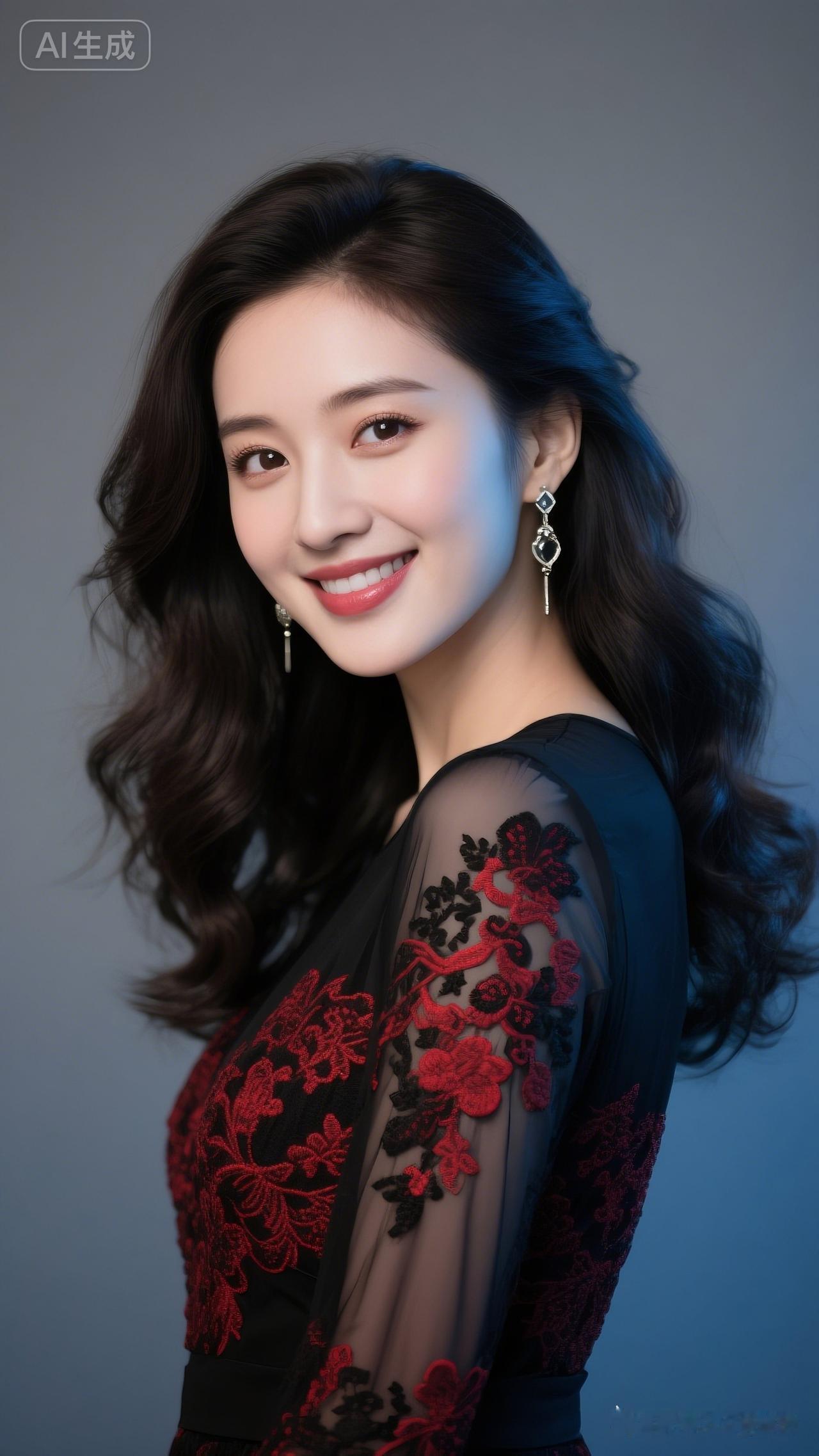 佳人微卷长发,妆容精致,明眸长睫,耳环轻摇。她颔首浅笑,亲切温和,每一处细节都美丽动人。