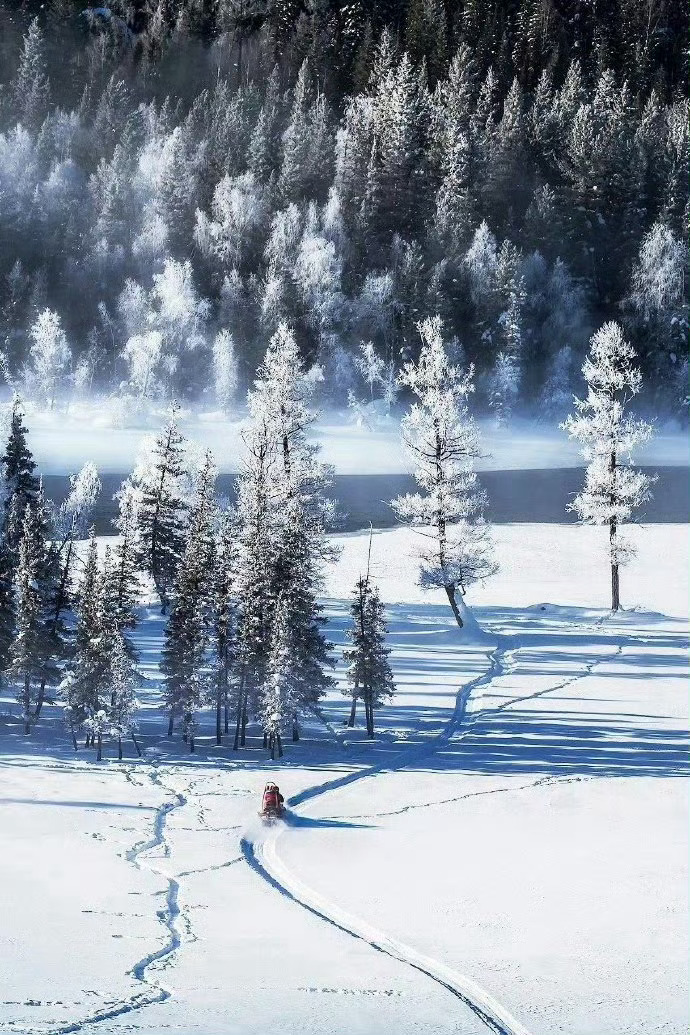 新疆的冬天,白雪覆盖了鲜花、草原、森林,封存了河流、湖泊,白雪将新疆变成了一幅安