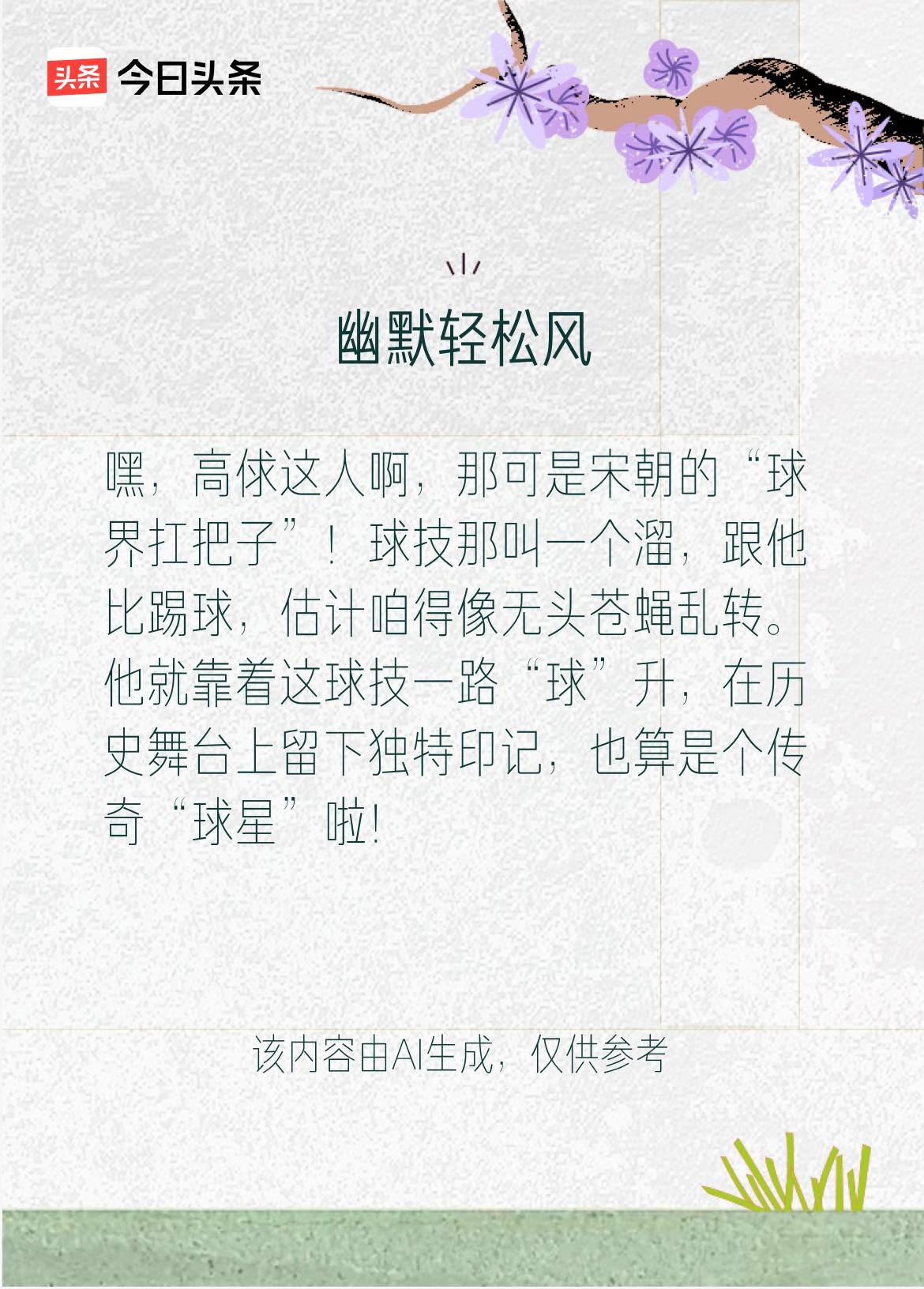 戳这里👉和我一起作诗词歌赋,赢万元大礼~高俅能从一介无名小卒,凭借球技得到皇帝赏识,进而平步青云,这在等级森严的封建时代,也算是个另类的逆袭故事。想象一下,在那热闹的球场之上,高俅脚法灵活,球就像粘在他脚上一样,随他任意摆布。对手们只能眼睁睁看着他在球场上纵横驰骋,无可奈何。 可这高俅啊,虽然球技高超,人品和为官之道可就不敢让人恭维了。他上位之后,在官场中结党营私,做了不少坏事,把朝廷搞得乌烟瘴气。他的故事也给后人提了个醒,有一技之长固然能让人崭露头角,但品德和才能需兼备,才能走得更稳更远。 怎么样,你是不是对这位宋朝“球界扛把子”更感兴趣了呢?快来参加我们的文学创作大会,用你手中的笔,书写属于你的诗词歌赋,一同探讨历史人物的传奇人生,还有万元大礼等你拿哟!👉点击就有机会参与~