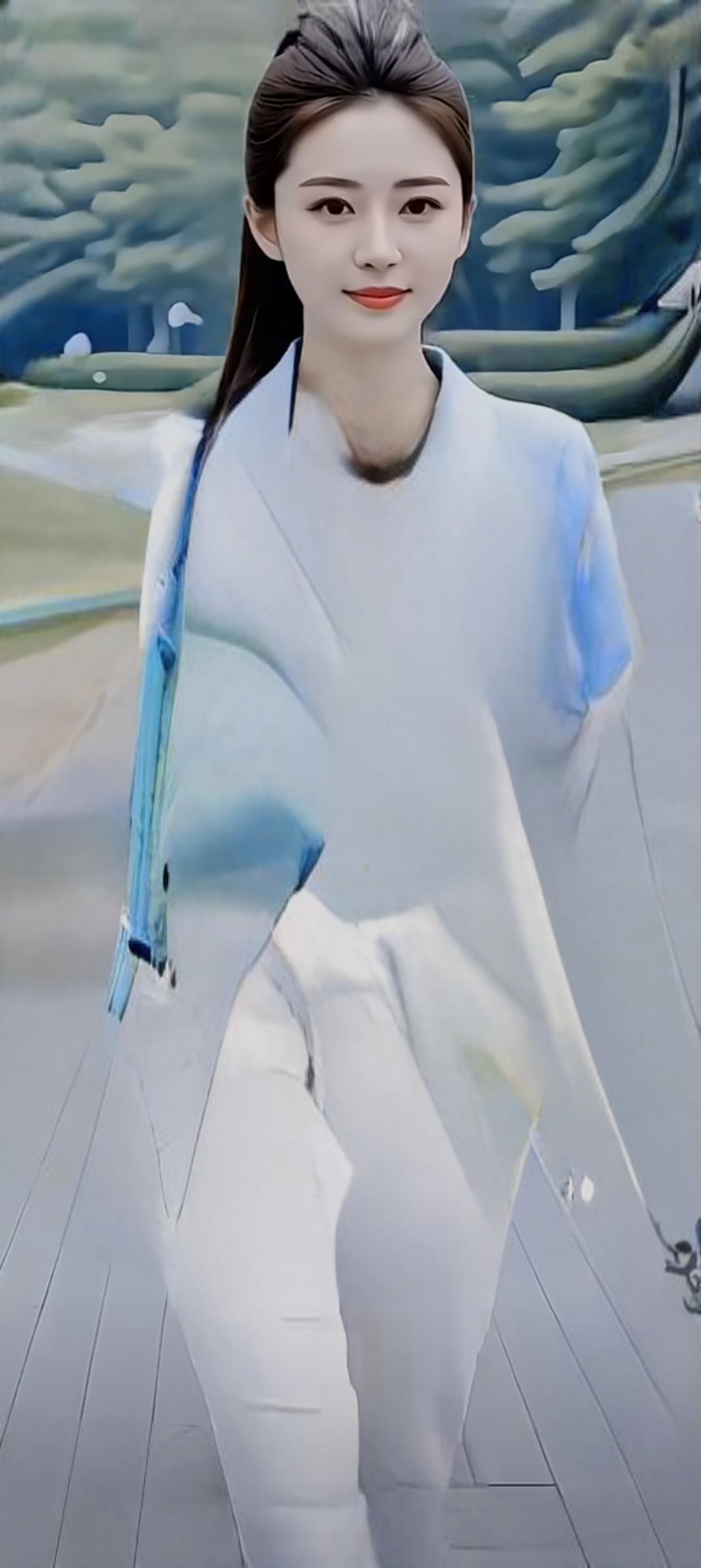 粉衣美人倚栏杆,微风拂面笑语闲。
