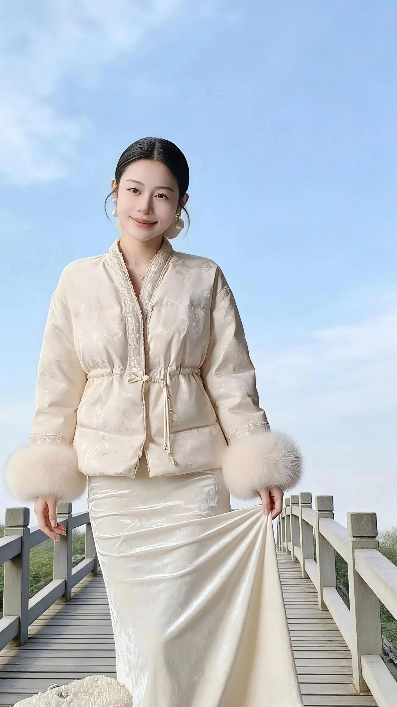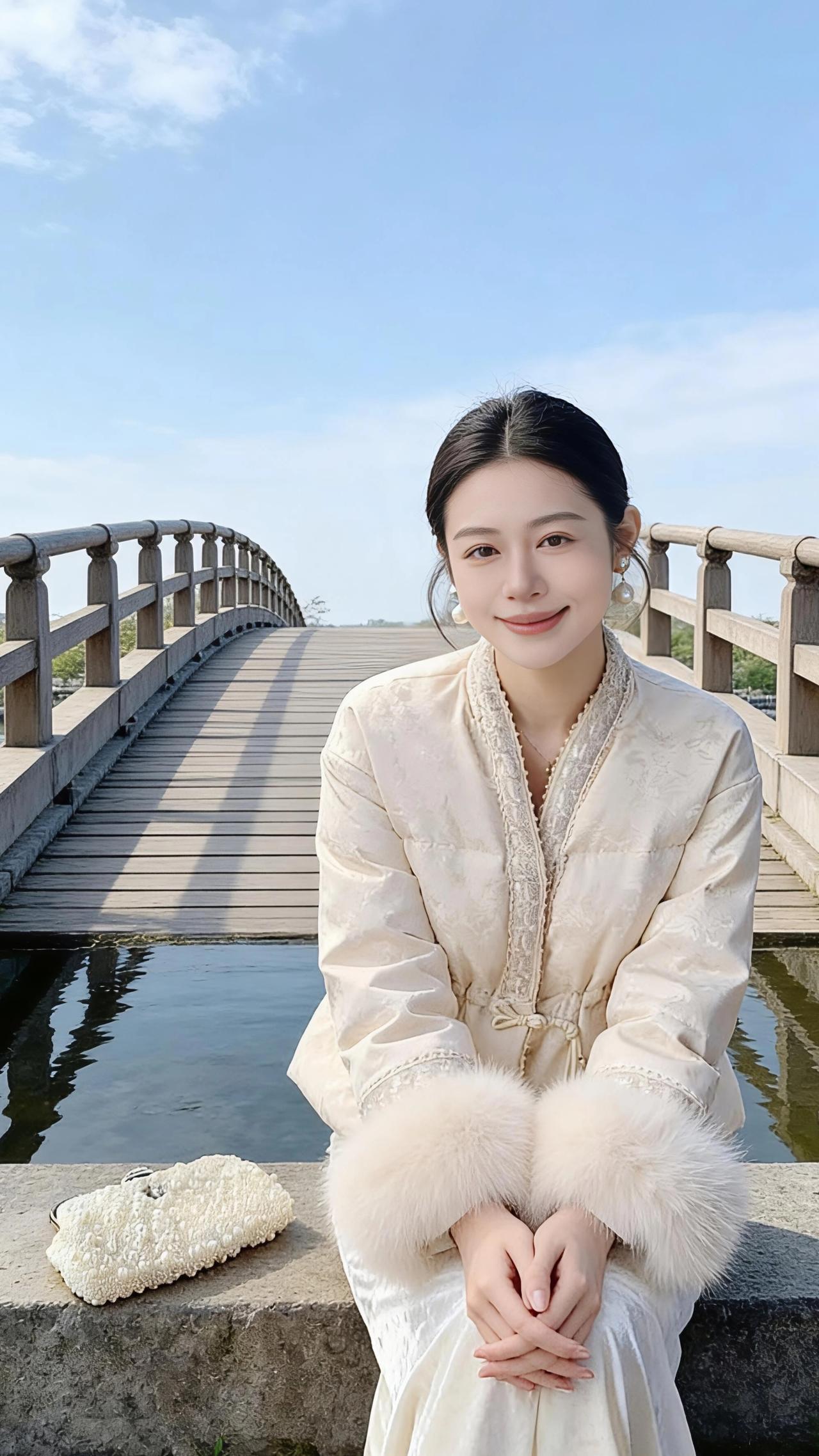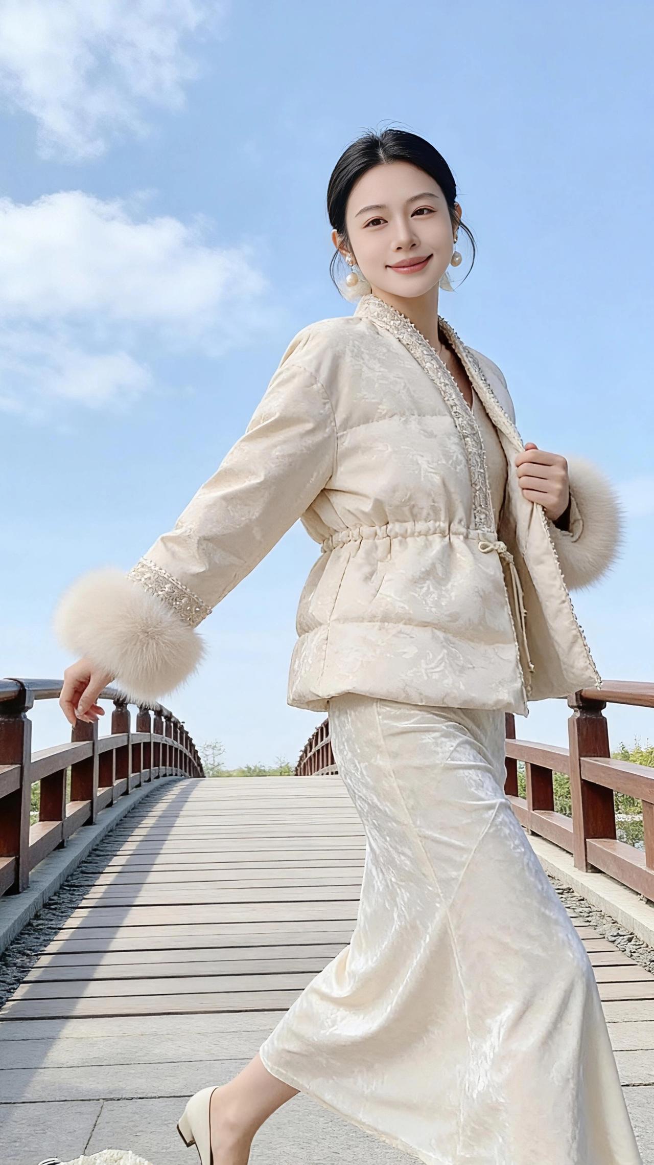 桥畔暖裳 晴光漫过木桥的栏杆,碎成粼粼的光斑,落在米白色的羽绒衣上,像揉了一把春日的棉絮。衣身的提花纹路在风里轻轻漾开,似江南水纹洇了淡墨,袖口的狐毛蓬松如云朵,挽住了这初冬的温柔。 她立在桥板上,指尖轻勾着丝绒长裙的下摆,布料滑腻如流水,与桥下的碧波相映。一步踏出去,裙摆便随步履旋出柔和的弧度,羽绒衣的收腰绳结轻轻晃动,将温婉的轮廓勾勒得恰到好处。 坐下来时,桥石的微凉被衣料隔在身外,唯有阳光透过发梢,吻在眉梢的笑意上。珍珠手包倚在身侧,与衣边的蕾丝滚边相衬,像撒了一把碎月。木桥的纹路刻着岁月的温软,流水淌过桥墩,和着衣袂轻响,成了这方天地里最温柔的韵律。 风掠过的时候,羽绒衣的蓬松裹住了细碎的凉意,毛袖拂过木栏,似触到了江南的软风。原来冬日的美好,从不是躲在暖室里,而是披一身温柔裳,与晴日、小桥、流水,撞个满怀。 高级感穿搭