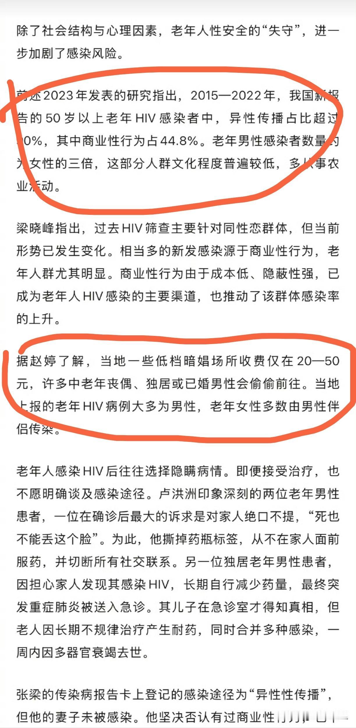 一位69岁的老村医,查出了艾滋病,却藏着掖着,连药瓶标签都撕掉,怕被别人发现。疾控中心的人说,在他们那边,有些老人会悄悄去那种只需20到50元,很便宜的地方解决需求。 人老了,身体的需求和心里的孤单并不会消失。但大部分人可能会觉得,人老了,身体机能衰退,哪还有这些需求? 在外面染上了这种病,被别人知道了肯定免不了指指点点。老话说“要脸”,这可能就是老人不愿意被别人知道的原因吧。