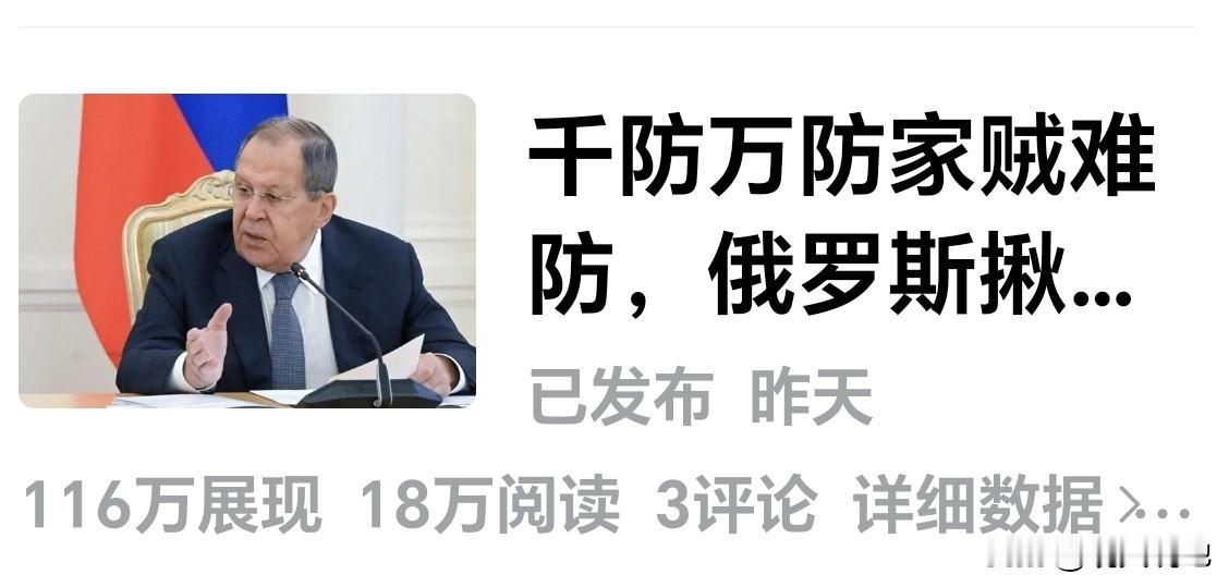 这个随手一发的微头条,竟然创下以往作品展现阅读的最高纪录,116万展现、18万阅读,对我这个名不见经传小写手来说,确实有点失宠若惊。 看样子千防万防家贼难防,不仅国家提高警惕严防“内鬼”,作为普通人做事做人也应是如此,信息了解畅通,决定一个人一个事成功的关键,闭门造车宅起来做人做事,难免必定会事半功倍,这需要必须掌握一手资料,既要知己又要知彼,才是成功取胜前提法宝。 有网友问老发这些东西,有什么用你不累吗!真的这只是个人喜好,至于收益多寡摆正心态最好,写出来东西有人看平台给展现,这就是我最大的欣慰,做任何事贵在坚持,平台粉丝激励就是我最大创作动力!粉友怎么看?以为这个头条会有收益多少?欢迎点赞评论分享!