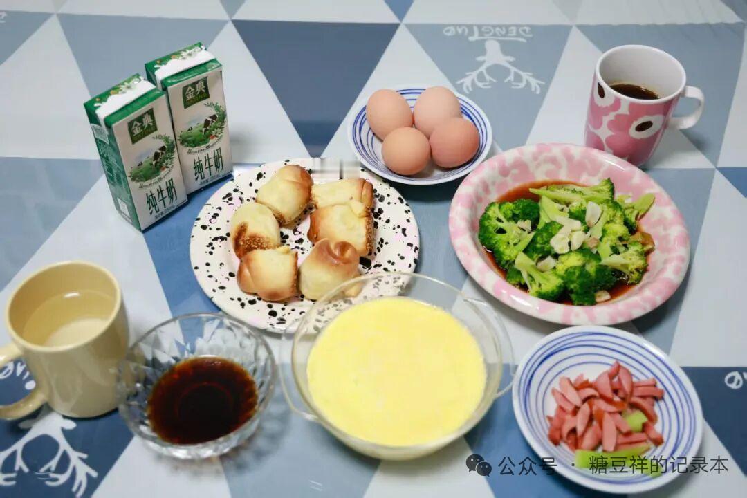 早餐必备:牛奶、面包、蔬菜、火腿,营养均衡!🍞🥚🥦🍖