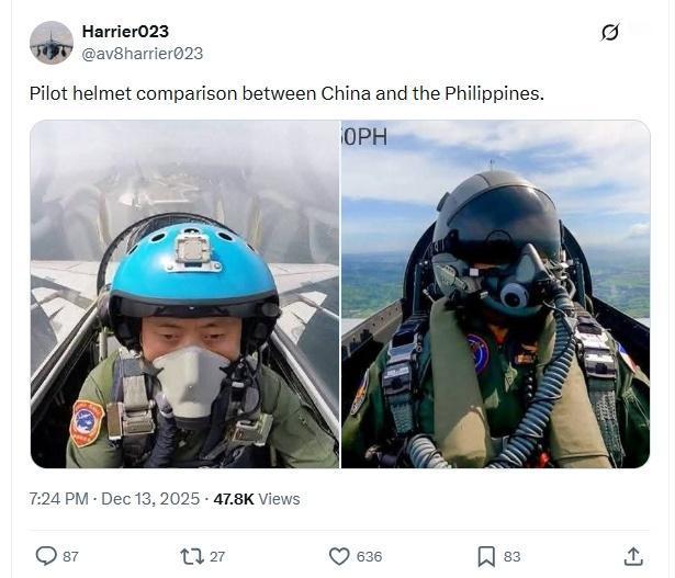 菲律宾也开始整“大剩赢学”! 一个菲律宾人发的,中国歼15飞行员头盔与菲律宾FA-50飞行员头盔。 发这张图,他就是想表达他们的头盔更先进。 先进不先进的先不说,这图片里的有啥区别?不就一个放下来护目镜吗? 经典幼儿园小朋友戴墨镜就装大哥。 如果按他那样的逻辑,那咱们的九天无人机怎么说,连头盔都没有。