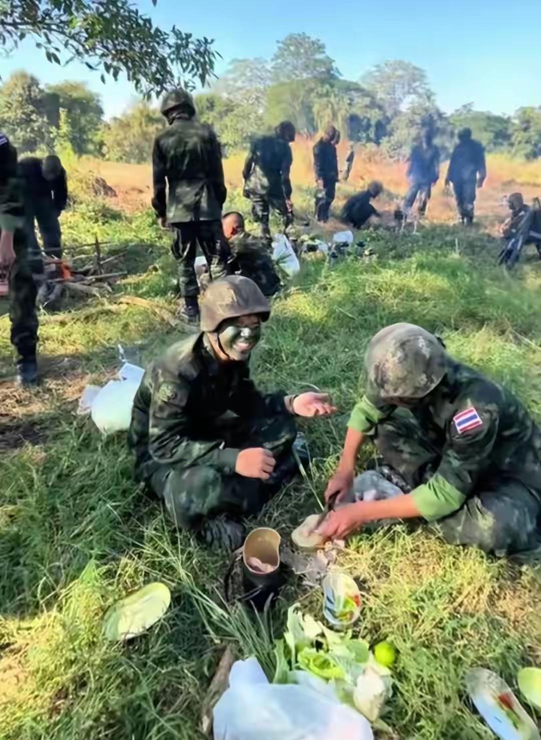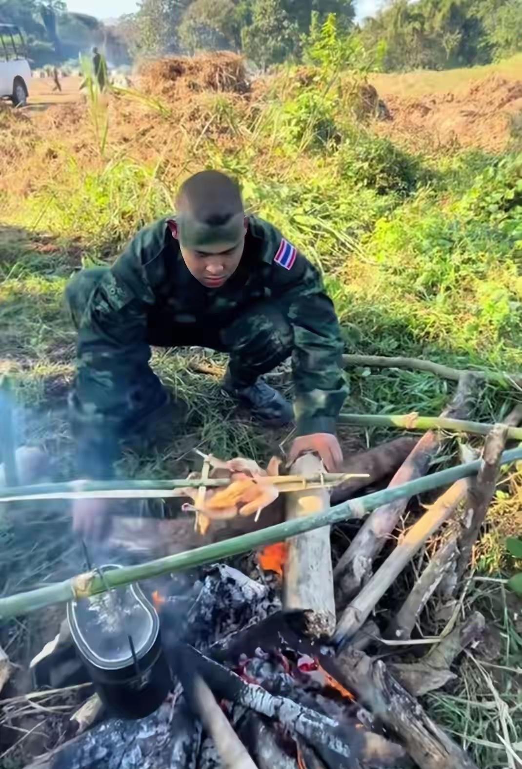 万万没想到,泰国士兵这么有松弛感,柬泰冲突都打成这样子了,泰国前线士兵还就地取材点火做烤鸡吃呢,可以看出泰国士兵有说有笑,有的士兵在切菜,不亦乐乎。泰国士兵这是一点也不怕柬埔寨的侦查或者炮火啊,做烤鸡还整这么大的烟。