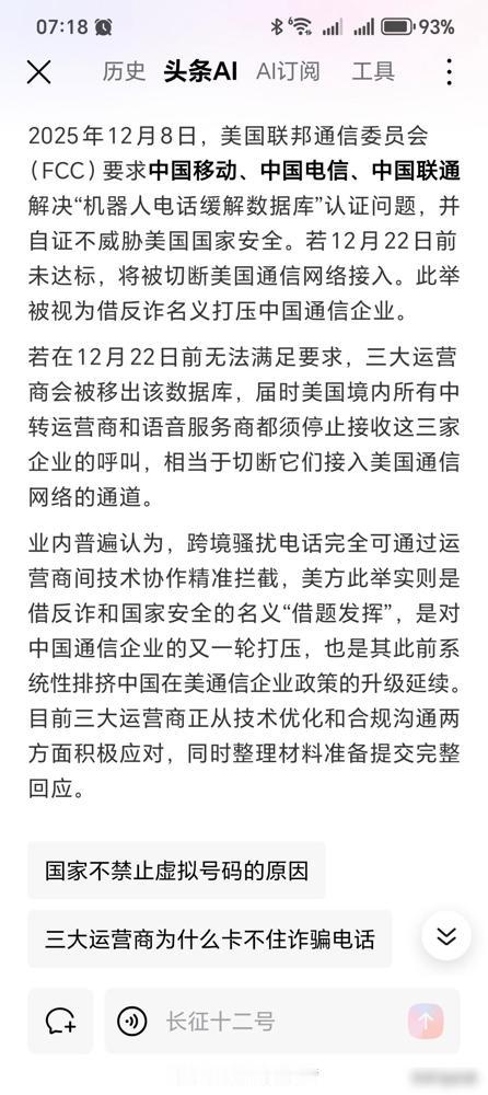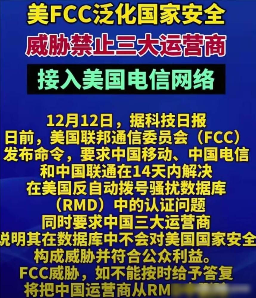 美国要求12月22号之前,中国移动,中国联通,中国电信三大运营商解决骚扰电话和保护公众问题! 先把事儿捋清楚:说的是美方给了一个明确期限,希望这三家把拦截骚扰、诈骗相关的问题处理好,核心就是别再让乱七八糟的电话打到公众手里。 我觉得这个要求本身不离谱。技术上能不能做?大概是能的,不然也不会被点名提出来。可现实是,大家谁没被轰炸过几轮电话。 卖保险的、推贷款的、培训班轮番上阵,还有更吓人的,直接冒充执法部门吓你一跳。你说运营商完全不知道?我有点不信;说一点办法都没有?也很难信。 关键点在这儿:要是真把源头管住了,被骗的人肯定会少一大截,普通人的日常干扰也会明显下降。这不是小事,是实实在在影响生活质量的那种。 然后我更在意的是,如果对外能被要求、被推动,那对内是不是也说明同样的事也“能做得到”,只是看重不重视、下不下决心。 当然,也可能有人会说拦太严影响正常通信,这个边界确实不好拿捏。但现在这个状态,明显是另一头太松了。 说个直白感受:谁都不想一接电话就先提高警惕。要是哪天真清静了,那不管在哪儿发生,都是好事。