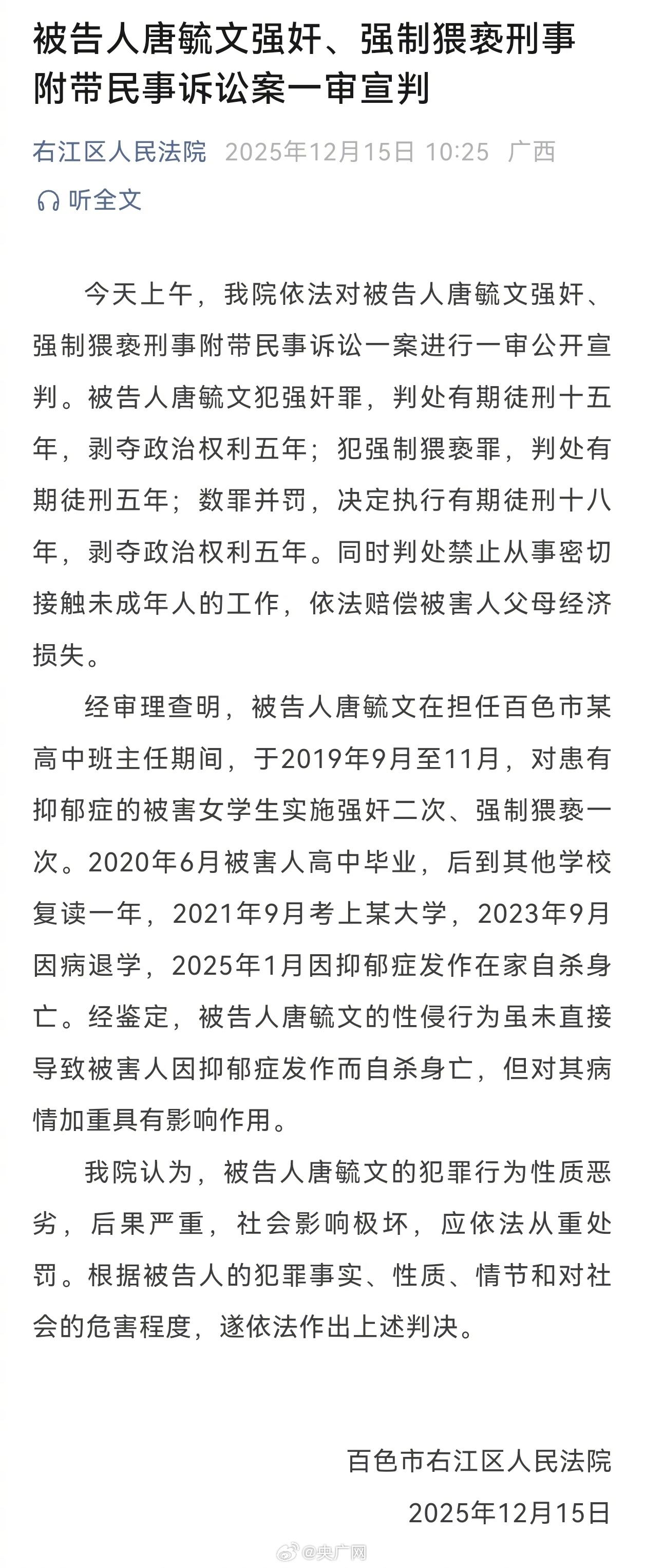 #百色教师性侵案一审宣判# 【#百色教师性侵学生一审获刑18年#】今天上午,百色市右江区人民法院依法对被告人唐毓文强奸、强制猥亵刑事附带民事诉讼一案进行一审公开宣判。被告人唐毓文犯强奸罪,判处有期徒刑十五年,剥夺政治权利五年;犯强制猥亵罪,判处有期徒刑五年;数罪并罚,决定执行有期徒刑十八年,剥夺政治权利五年。同时判处禁止从事密切接触未成年人的工作,依法赔偿被害人父母经济损失。经审理查明,被告人唐毓文在担任百色市某高中班主任期间,于2019年9月至11月,对患有抑郁症的被害女学生实施强奸二次、强制猥亵一次。2020年6月被害人高中毕业,后到其他学校复读一年,2021年9月考上某大学,2023年9月因病退学,2025年1月因抑郁症发作在家自杀身亡。经鉴定,被告人唐毓文的性侵行为虽未直接导致被害人因抑郁症发作而自杀身亡,但对其病情加重具有影响作用。我院认为,被告人唐毓文的犯罪行为性质恶劣,后果严重,社会影响极坏,应依法从重处罚。根据被告人的犯罪事实、性质、情节和对社会的危害程度,遂依法作出上述判决。(右江区人民法院)