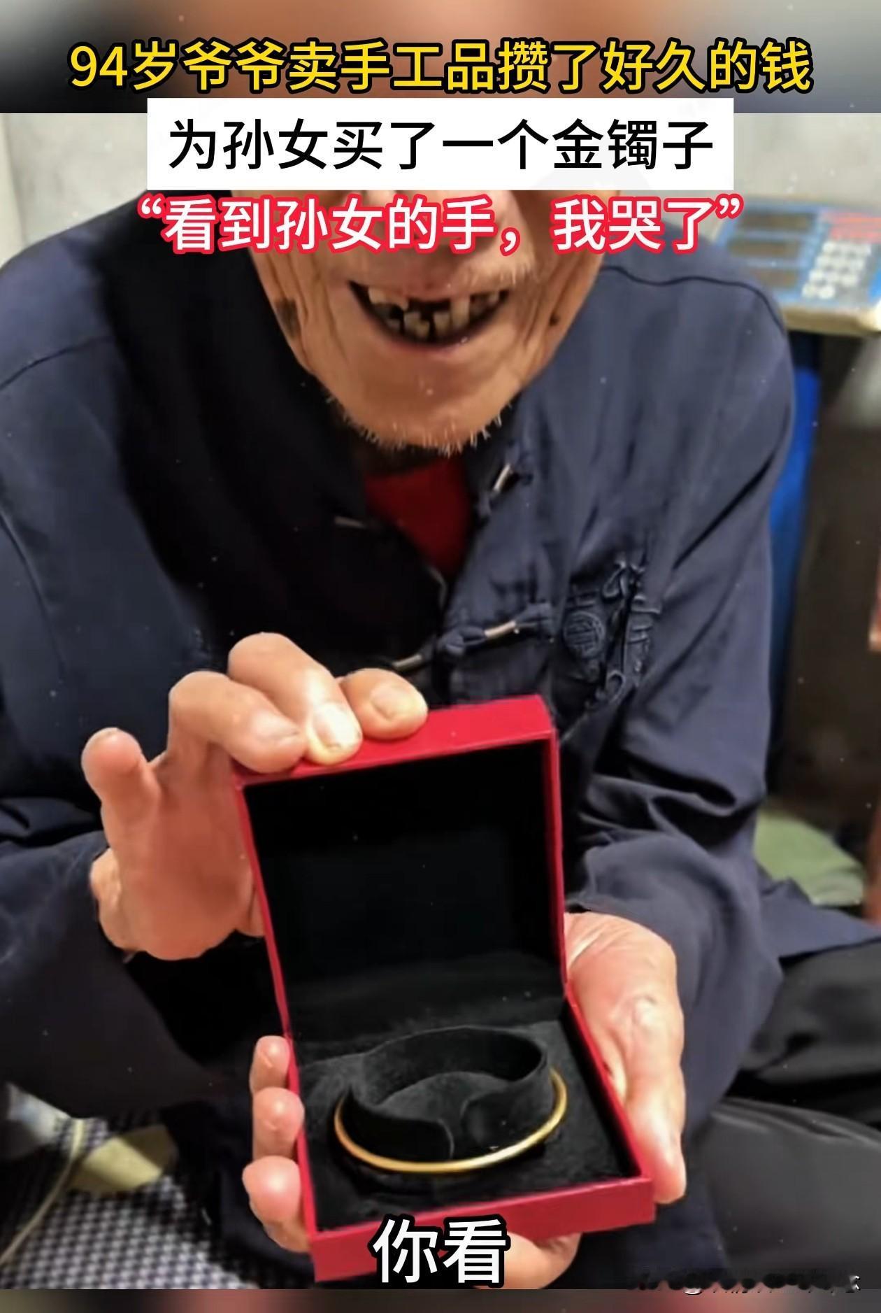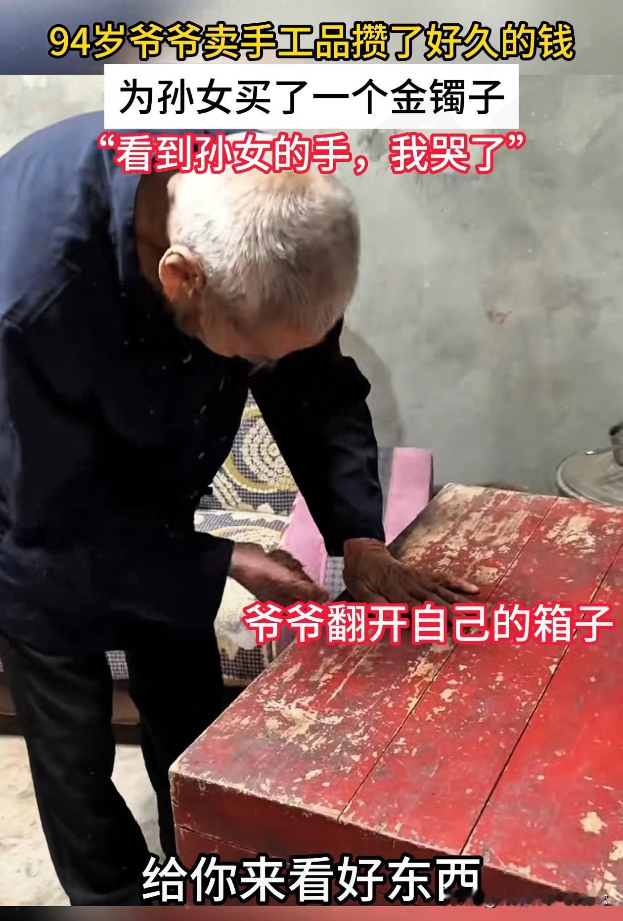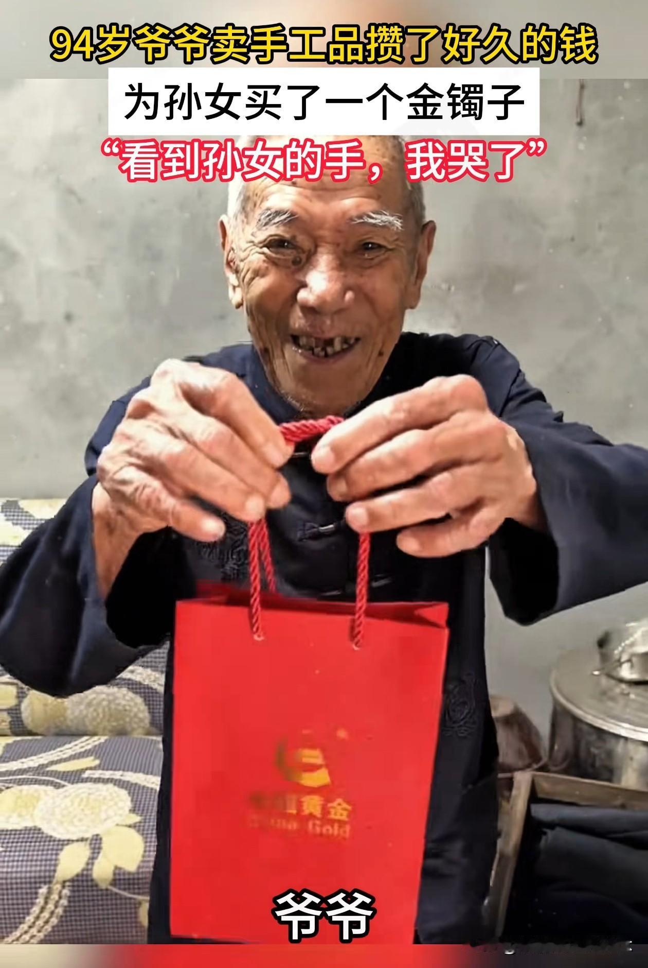 94岁的爷爷靠卖手工攒钱, 给孙女买了一个金镯子, 当孙女伸出手时,我忍不住哭了。 刚刷到一个视频,一个老爷爷让孙女跟着进屋,像是有什么神秘礼物要给她。爷爷翻开自己陈旧的箱子,里面装满了衣服,他又从衣服中间拿出一个红色的袋子,是一个装黄金首饰的礼品袋。 爷爷笑盈盈的双手递给孙女,之后亲手打开包装,原来首饰盒里是一个金镯子。这一刻,爷爷笑得像个孩子。这并不是最让人感动的,当孙女伸出手的那一刻,我的心突然紧了一下,这是一双受过伤的手,有伤痕,有残缺,但此刻被爱包裹。 我不是羡慕那个金镯子,而是羡慕她有疼爱她的爷爷,生活也许遭遇不如意,但是还有爷爷在身边,感受他带来的温暖,视她为珍宝,捧她在手心。 曾经我也有一个爱我的爷爷,总是在我上学前塞给我零花钱,放学后给我准备我最爱吃的烤红薯。在我的记忆里,他总是用手捋着他那长长的白胡子,笑盈盈的看着我。如今,他离开我二十年了,他的模样始终无法忘记,可是,却再也触摸不到了…… 你的爷爷,是否也这样爱过你?若他还在,请多陪陪他;若他已远行,请记住他的爱。