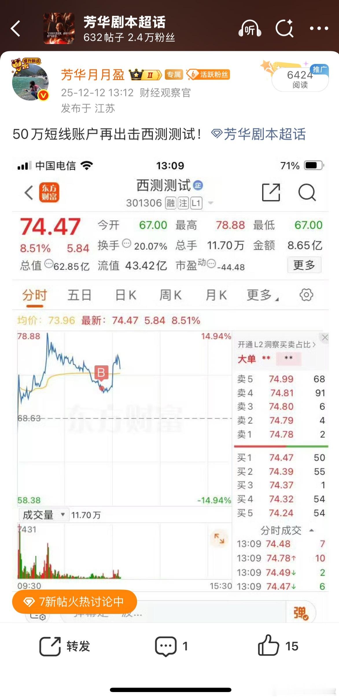 上周五芳华短线账户果断出击的$西测测试 sz301306$ ,轻轻松松20个点到手,有同车的宝子嘛?芳华剧本