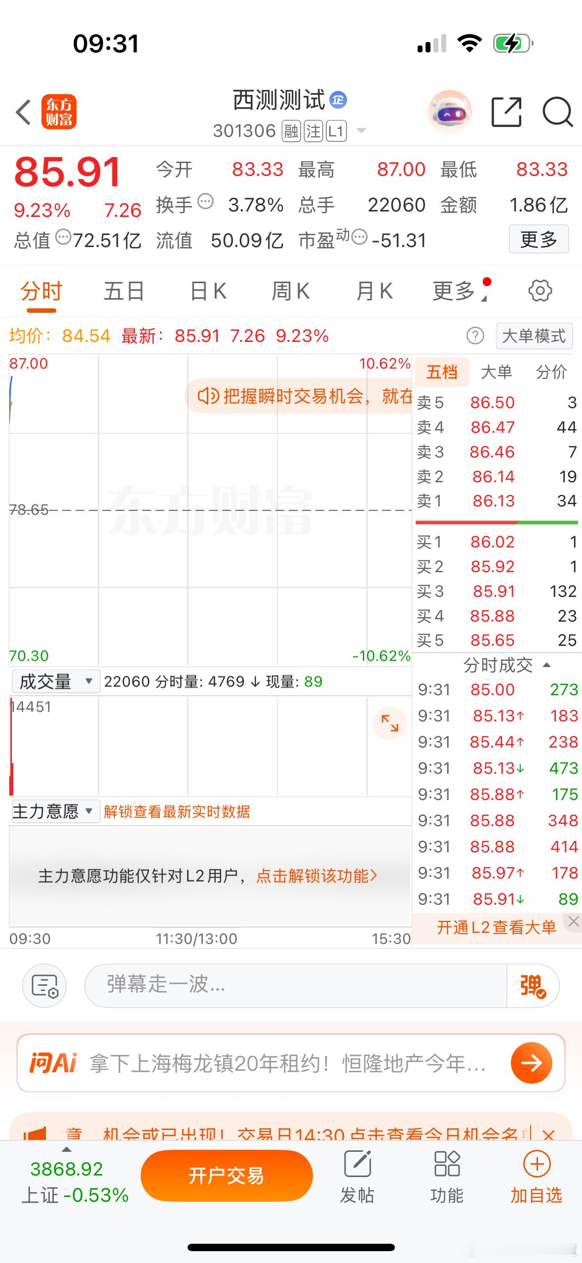 上周五芳华短线账户果断出击的$西测测试 sz301306$ ,轻轻松松20个点到