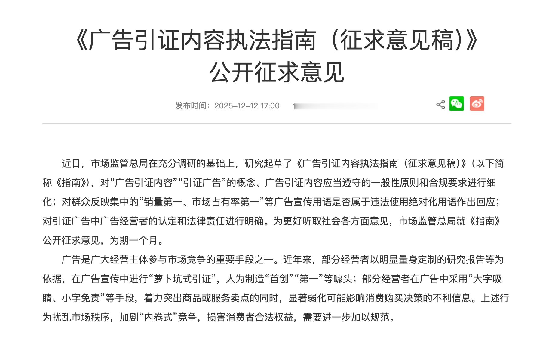 市场监管总局就《广告引证内容执法指南(征求意见稿)》公开征求意见,对群众反映集中的“销量第一、市场占有率第一”等广告宣传用语是否属于违法使用绝对化用语作出回应;对引证广告中广告经营者的认定和法律责任进行明确。
