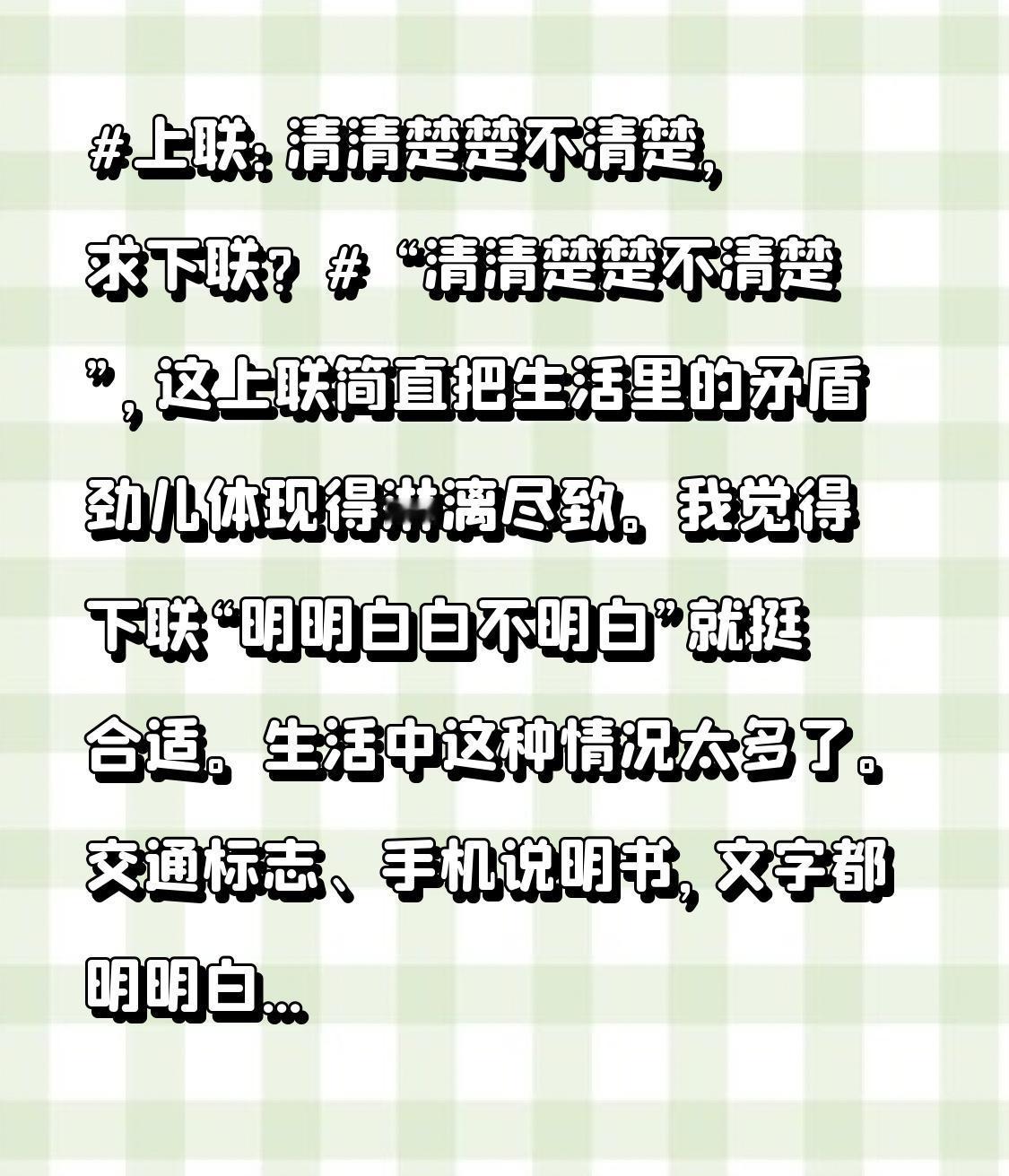 “清清楚楚不清楚”,这上联简直把生活里的矛盾劲儿体现得淋漓尽致。我觉得下联“明明白白不明白”就挺合适。 生活中这种情况太多了。交通标志、手机说明书,文字都明明白白的,可实际用起来还是一头雾水。领导开会说“简单讲两句”,每个字都清楚,可听完却不知道重点是啥。感情里对方说“没事”,心里知道肯定有事,但就是搞不明白到底咋回事。有些道理书上写得再明白,不自己摔跟头也不会真懂。就像小时候爸妈说“烫别摸”,非得摸一下才长记性。生活就是这么奇妙,看似清楚,实则糊涂。